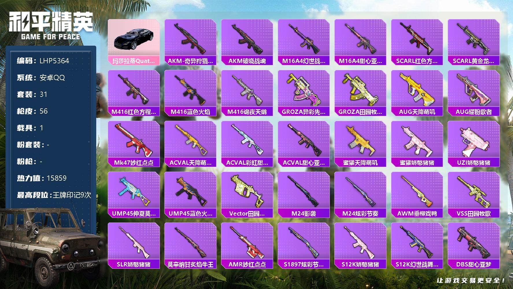 - [12338637]素材身法号/无敌战神框1【特价急出/详情看图】:苹果 手Q-无敌战神框-5粉装-4特效枪-1载具-1粉色飞行器-9.2w热力值-21王牌印记-200套装-255枪皮【热门品类】:粉装-梦幻火箭,套装-浪漫天命,角色-军刀雅典娜,套装-胖达圆圆,套装-龟仙人,套装-浪漫波比【粉色载具】:玛莎拉蒂Ghibli(粉)【粉色套装】:粉装-梦幻火箭,角色-复仇流浪者,粉装-第五大道,粉装-蜜语绒猫,角色-千金淑猫【粉色枪皮等级】:SCAR-L-锦绣绵绵(五级),M416-五爪金龙(七级),Kar98K-巳巳如意(五级),DP-28-豹影疾电(五级)【粉色飞行器】:梦幻舞会飞行器