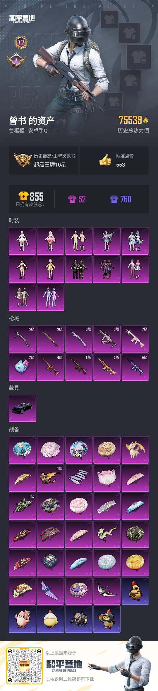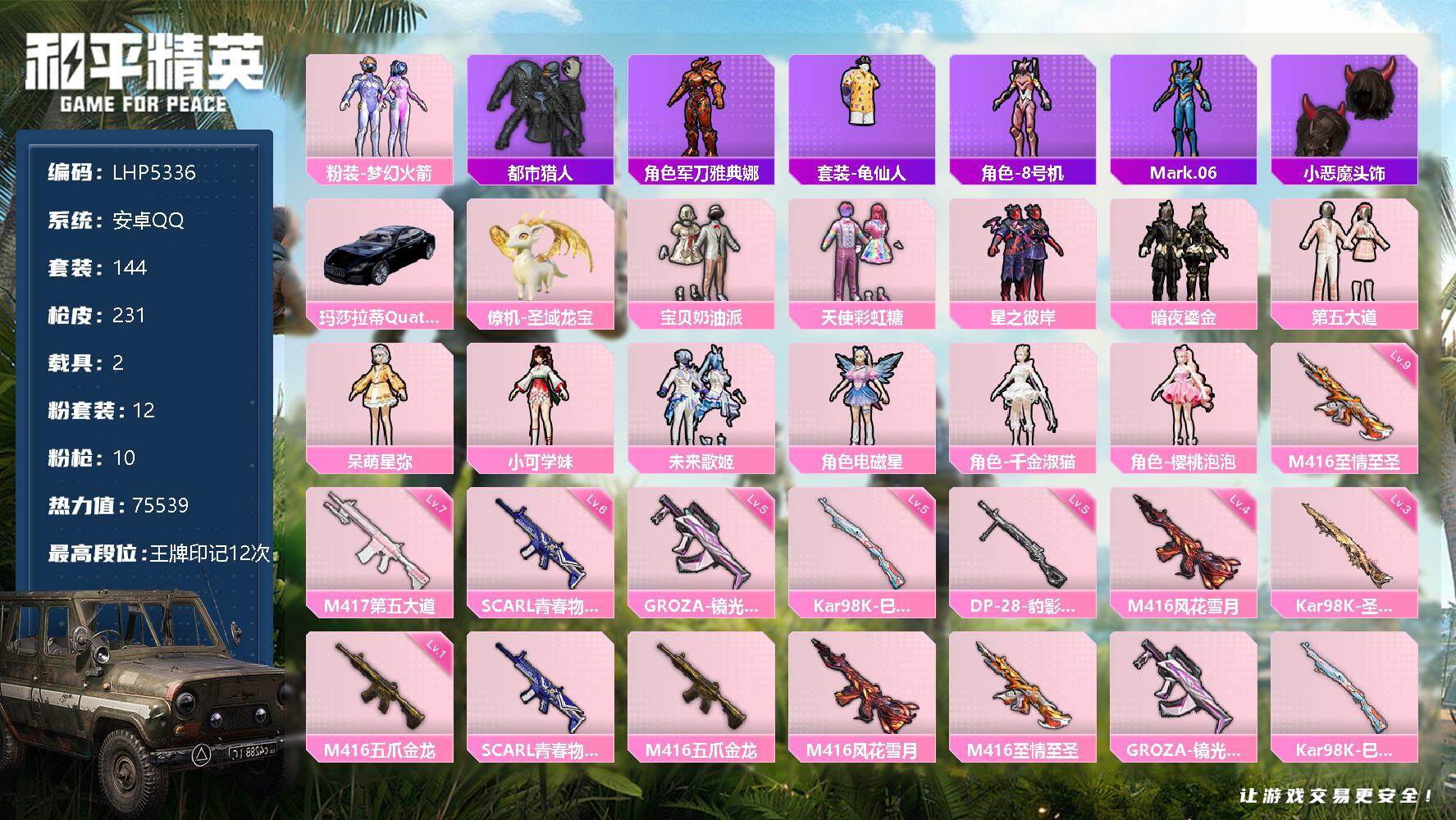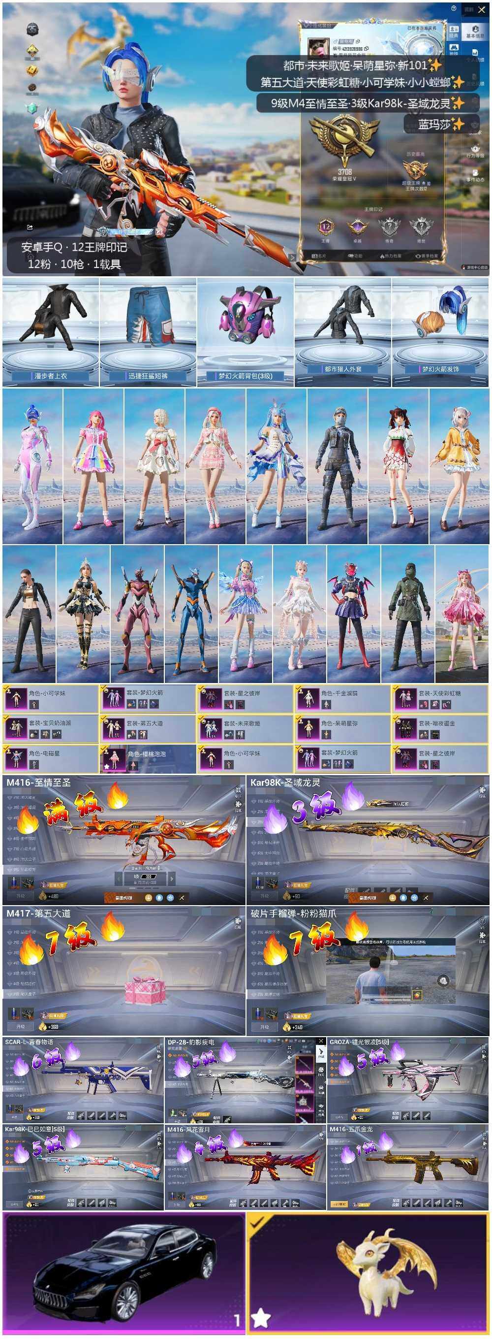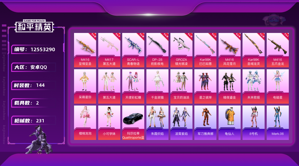 [12553290]连体王者v8-265皮肤-22传说-4珍品-2典藏 / 素材身法号/地铁满天赋/M416-至情至圣(九级)【特价急出/详情看图】:安卓 手Q-12粉装-10特效枪-2载具-6粉色飞行器-7.5w热力值-12王牌印记-144套装-231枪皮【热门品类】:粉装-梦幻火箭,套装-都市猎人,角色-军刀雅典娜,套装-龟仙人,角色-8号机,角色-Mark.06,小恶魔头饰【粉色载具】:玛莎拉蒂Quattroporte(夜幕蓝),僚机-圣域龙宝【粉色套装】:粉装-宝贝奶油派,粉装-天使彩虹糖,粉装-梦幻火箭,粉装-星之彼岸,粉装-暗夜鎏金,粉装-第五大道,角色-呆萌星弥,角色-小可学妹,粉装-未来歌姬,角色-电磁星,角色-千金淑猫,角色-樱桃泡泡【粉色枪皮等级】:SCAR-L-青春物语(六级),M416-五爪金龙(一级),M416-风花雪月(四级),M416-至情至圣(九级),GROZA-镜光银凌(五级),Kar98K-巳巳如意(五级),Kar98K-圣域龙灵(三级),M417-第五大道(七级),DP-28-豹影疾电(五级)【粉色飞行器】:梦幻火箭飞行器,闪光银龙飞行器,黄族统领飞行器,镜域双华-灵镜之阶,幽焰列车飞行器,圣域金龙飞行器