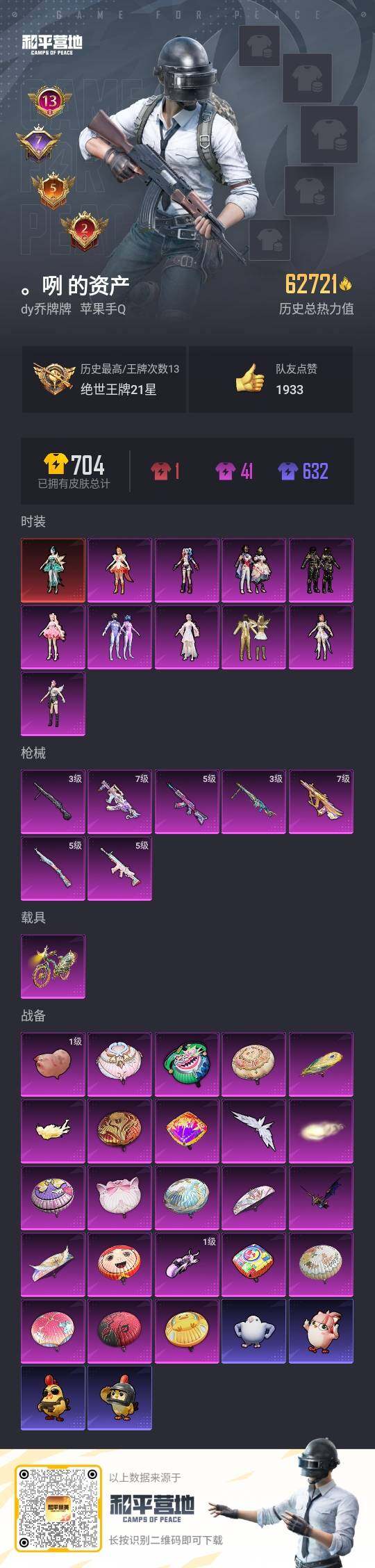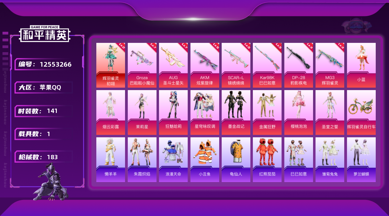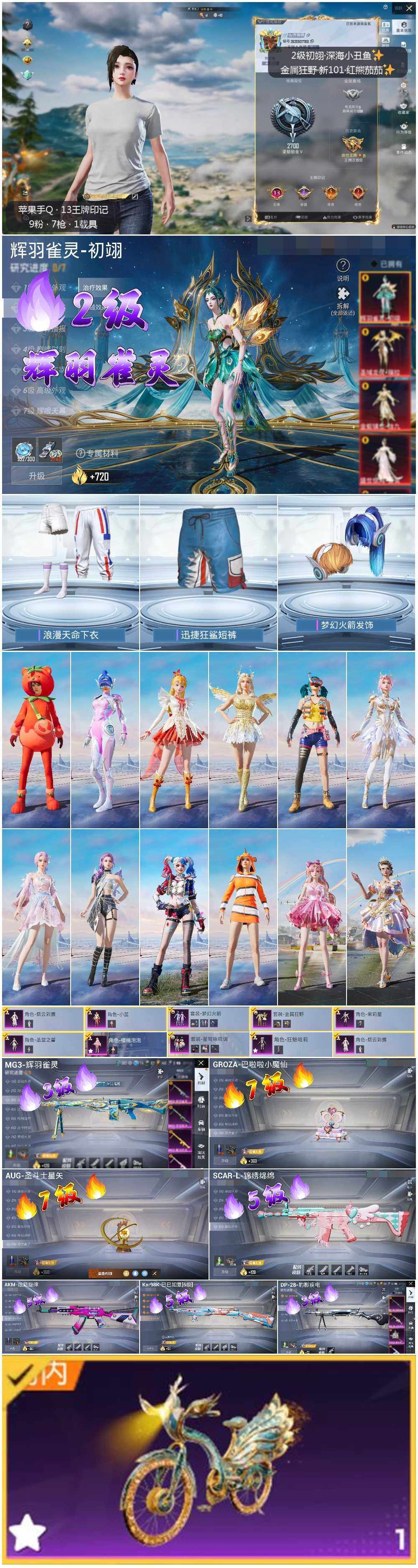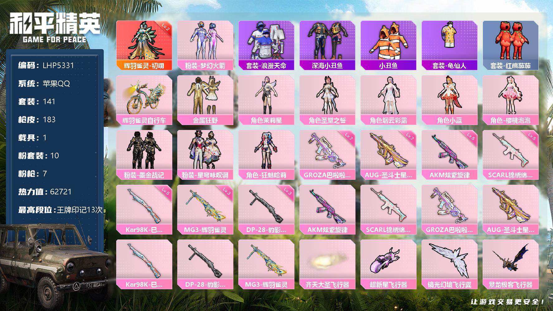 [12553266]素材身法号【特价急出/详情看图】:苹果 手Q-1神装-10粉装-7特效枪-1载具-6粉色飞行器-6.2w热力值-13王牌印记-141套装-183枪皮【红色神装等级】:辉羽雀灵-初翊(二级)【热门品类】:粉装-梦幻火箭,套装-浪漫天命,套装-深海小丑鱼,套装-小丑鱼,套装-龟仙人,套装-红熊茄茄【粉色载具】:辉羽雀灵自行车【粉色套装】:粉装-梦幻火箭,粉装-金属狂野,角色-茉莉星,角色-圣堂之誓,角色-烟云彩露,角色-小蓝,角色-樱桃泡泡,粉装-墨金战记,粉装-星穹咏叹调,角色-狂魅哈莉【粉色枪皮等级】:AKM-炫紫旋律(五级),SCAR-L-锦绣绵绵(五级),GROZA-巴啦啦小魔仙(七级),AUG-圣斗士星矢(七级),Kar98K-巳巳如意(五级),DP-28-豹影疾电(三级),MG3-辉羽雀灵(三级)【粉色飞行器】:齐天大圣飞行器,超新星飞行器,镜光幻境飞行翼,繁龙极客飞行器,雀灵庇佑飞行器,飞天猪飞行器