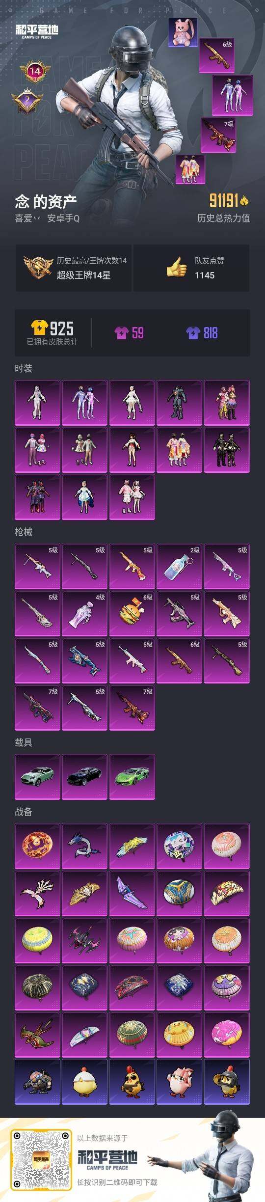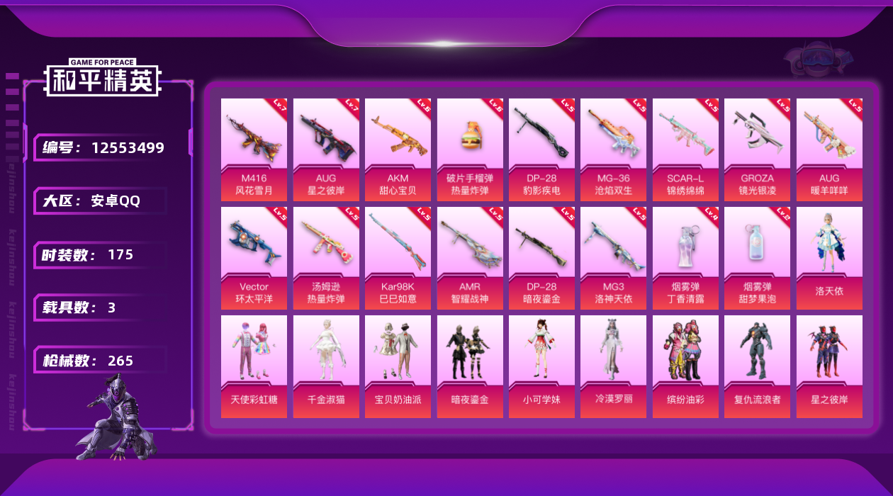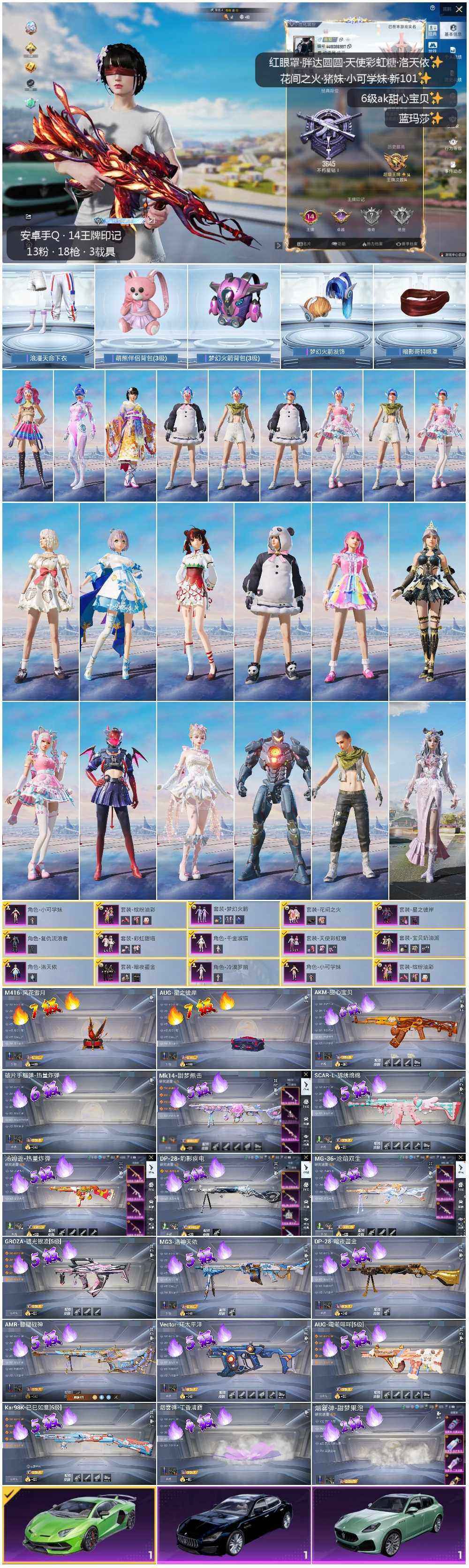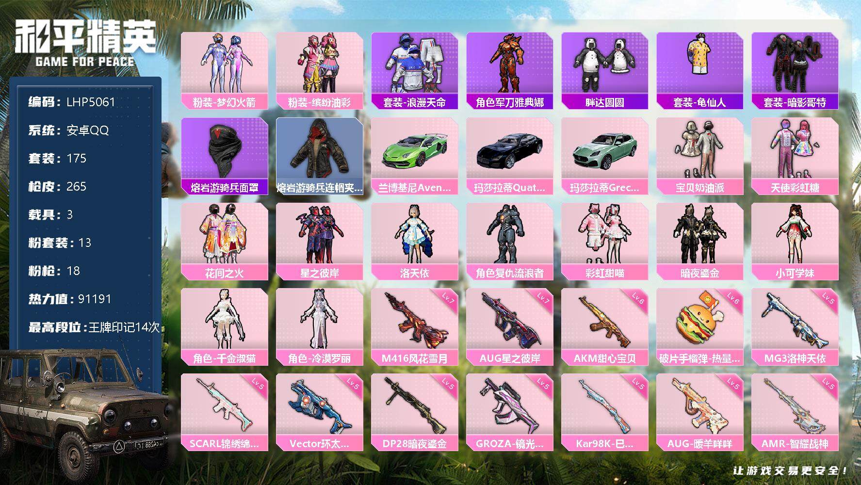 [12553499]女公主素材身法号/地铁满天赋【特价急出/详情看图】:安卓 手Q-13粉装-18特效枪-3载具-5粉色飞行器-9.1w热力值-14王牌印记-175套装-265枪皮【热门品类】:粉装-梦幻火箭,粉装-缤纷油彩,套装-浪漫天命,角色-军刀雅典娜,套装-胖达圆圆,套装-龟仙人,套装-暗影哥特,熔岩游骑兵面罩,熔岩游骑兵连帽夹克【粉色载具】:兰博基尼Aventador SVJ(翡翠绿),玛莎拉蒂Quattroporte(夜幕蓝),玛莎拉蒂Grecale(薄荷绿)【粉色套装】:粉装-宝贝奶油派,粉装-天使彩虹糖,粉装-梦幻火箭,粉装-缤纷油彩,粉装-花间之火,粉装-星之彼岸,角色-洛天依,角色-复仇流浪者,粉装-彩虹甜喵,粉装-暗夜鎏金,角色-小可学妹,角色-千金淑猫,角色-冷漠罗丽【粉色枪皮等级】:AKM-甜心宝贝(六级),SCAR-L-锦绣绵绵(五级),M416-风花雪月(七级),GROZA-镜光银凌(五级),AUG-星之彼岸(七级),AUG-暖羊咩咩(五级),Vector-环太平洋(五级),汤姆逊-热量炸弹(五级),Kar98K-巳巳如意(五级),Mk14-甜梦熊击(五级),AMR-智耀战神(五级),DP-28-暗夜鎏金(五级),DP-28-豹影疾电(五级),MG3-洛神天依(五级),MG-36-沧焰双生(五级),烟雾弹-丁香清露(四级),烟雾弹-甜梦果泡(二级),破片手榴弹-热量炸弹(六级)【粉色飞行器】:梦幻火箭飞行器,星之彼岸飞行器,翩跹演武飞行器,凤舞九天飞行器,灵珠游龙飞行器
