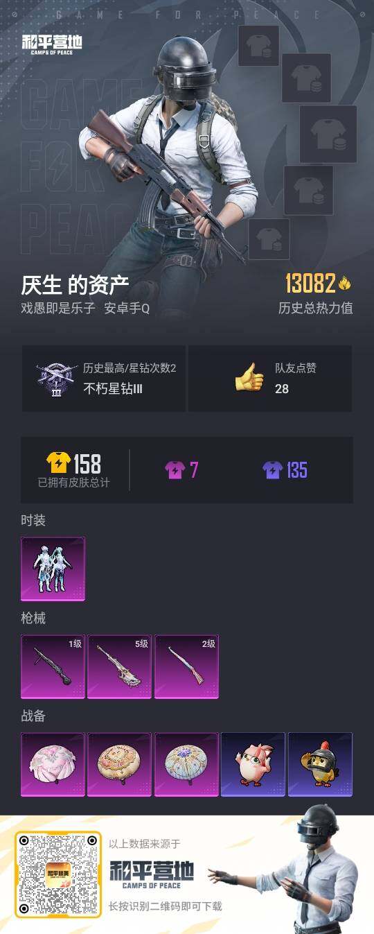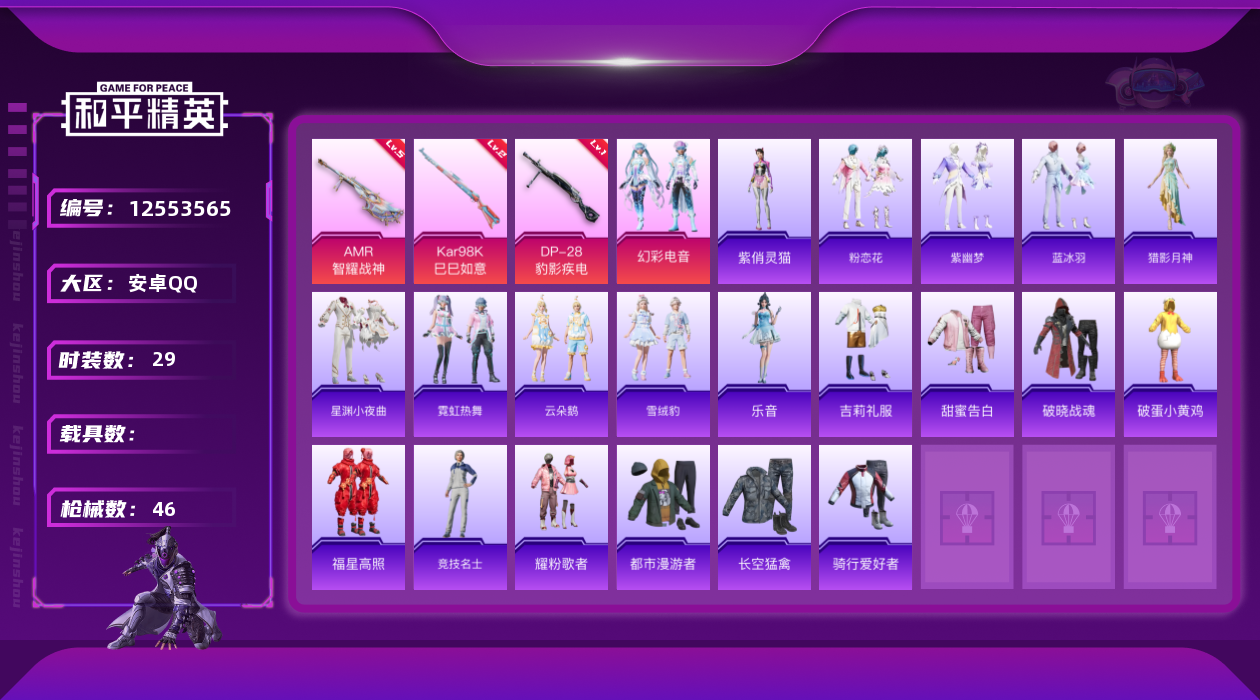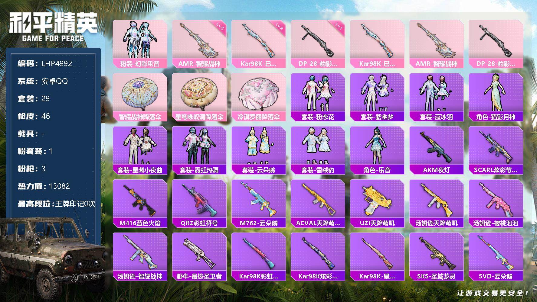 [12553565]【特价急出/详情看图】:安卓 手Q-1粉装-3特效枪-1.3w热力值-2王牌印记-29套装-46枪皮【粉色套装】:粉装-幻彩电音【粉色枪皮等级】:Kar98K-巳巳如意(二级),AMR-智耀战神(五级),DP-28-豹影疾电(一级)