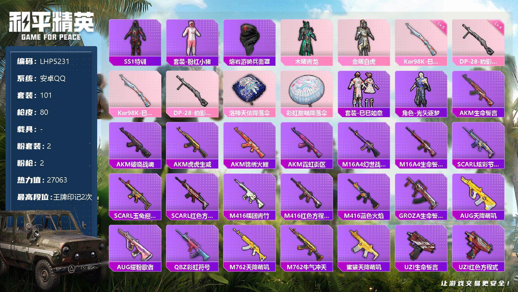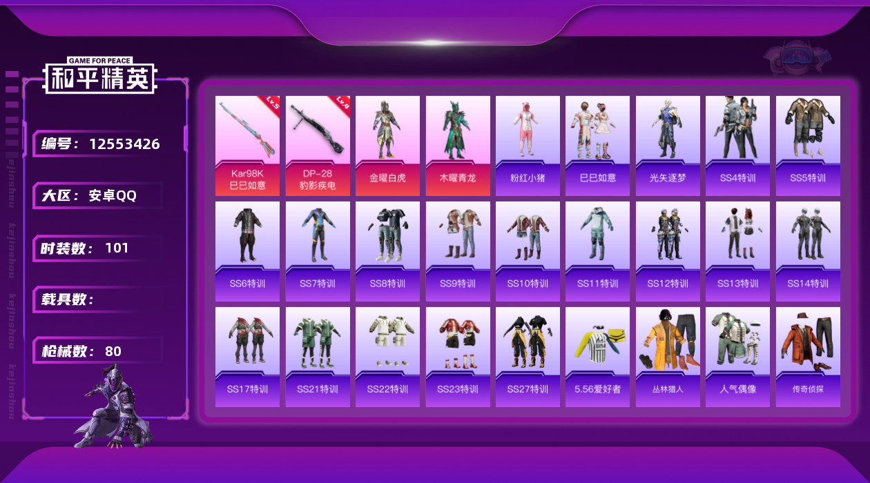 [12553426]地铁满天赋【特价急出/详情看图】:安卓 手Q-2粉装-2特效枪-1粉色飞行器-2.7w热力值-2王牌印记-101套装-80枪皮【热门品类】:套装-SS1特训,套装-粉红小猪,熔岩游骑兵面罩【粉色套装】:粉装-木曜青龙,粉装-金曜白虎【粉色枪皮等级】:Kar98K-巳巳如意(五级),DP-28-豹影疾电(四级)