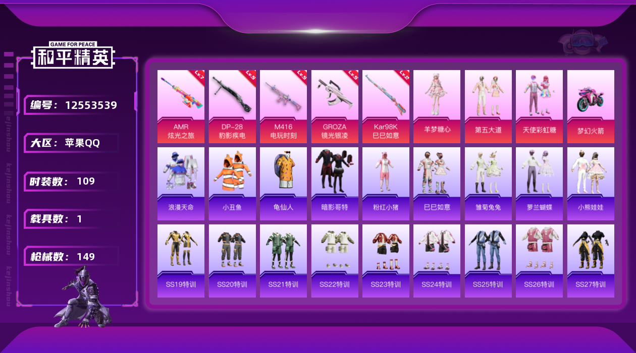 - [12809608]苹果 手Q-4粉装-5特效枪-1载具-3粉色飞行器-52176热力值-10王牌印记-134套装-171枪皮 【热门品类】:套装-龟仙人,套装-潮萌小黄鸭 【粉色载具】:玛莎拉蒂Quattroporte(夜幕蓝) 【粉色套装】:粉装-橘柚倾心,角色-光极星,角色-异瞳寒姬 【粉色枪皮等级】:SCAR-L-锦绣绵绵(五级),GROZA-镜光银凌(五级),AUG-暖羊咩咩(五级),Kar98K-巳巳如意(五级),DP-28-豹影疾电(五级) 【粉色枪皮】:SCAR-L-锦绣绵绵,GROZA-镜光银凌,AUG-暖羊咩咩,Kar98K-巳巳如意,DP-28-豹影疾电 【粉色飞行器】:彩虹独角兽飞行器,月下星之子飞行器 【粉色降落伞】:筑梦精灵降落伞,甜梦小狐降落伞,旋转彩虹降落伞,圣堂之誓降落伞,千金淑猫降落伞,鬼刀降落伞,星穹咏叹调降落伞 【稀有套装】:套装-龟仙人,套装-雏菊兔兔,套装-萝兰蝴蝶,套装-糖糖葫芦,套装-青团波波,套装-燕燕于飞,套装-鱼渊荷华,角色-风玲,套装-焰舞炽心,角色-时希公主 【稀有枪皮】:AKM-星之彼岸,AKM-灼热熔岩,AKM-破晓战魂,AKM-霓虹街区,M16A4-红色方程式,M16A4-魔法学院,SCAR-L-炫彩节奏,SCAR-L-玉兔迎春,SCAR-L-红色方程式,M416-夜灯,M416-糯团青竹,M416-紫翼圣骑,M416-红色方程式,M416-蓝色火焰,GROZA-紫翼圣骑,GROZA-黑色刀锋,AUG-甜蜜菠萝,AUG-耀粉歌者,QBZ-神秘黑猫,QBZ-飞驰魅影,M762-快乐主宰,M762-拳皇97,M762-橘柚倾心,M762-牛气冲天,AC-VAL-天降萌叽,AC-VAL-快闪甜心,蜜獾-天降萌叽,蜜獾-娇憨猪猪,Famas-月下星之子,UZI-啾咪啾咪,UZI-娇憨猪猪,UZI-炫彩节奏,UZI-生命誓言,UMP45-夜灯,UMP45-生命誓言,UMP45-蓝色火焰,Vector-彩虹符号,Vector-生命誓言,Vector-黑色刀锋,汤姆逊-天降萌叽,汤姆逊-炫彩节奏,P90-快闪甜心,P90-筑梦精灵,P90-飞驰魅影,P90-巳巳如意,Kar98K-彩虹符号,Kar98K-炫彩节奏,Kar98K-红色方程式,Kar98K-飞驰魅影,M24-炫彩节奏,SKS-夜灯,SKS-炫彩节奏,VSS-黑色刀锋,Mi