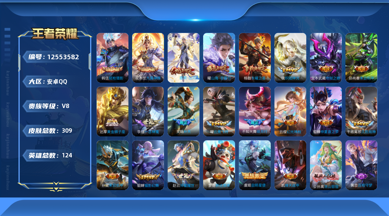 [12553582]对抗路33段/打野30段【特价急出/详情看图】:安卓Q-V8-永恒钻石III段位-124英雄-309皮肤-2典藏-20传说-95史诗 【荣耀典藏】:花木兰九霄神辉,韩信弑枪猎影 【传说皮肤】:司空震愿照山河定,云缨幻光神枪,曜山海苍雷引,不知火舞绯月行,女娲补天,孙策末日机甲,赵云淬星耀世,铠绛天战甲,镜炽阳神光,虞姬启明星使,曜云鹰飞将,李信一念神魔,貂蝉猫影幻舞,干将莫邪久胜战神,达摩黄金狮子座,梦奇胖达荣荣,杨戬永曜之星,貂蝉仲夏夜之梦,孙尚香末日机甲,宫本武藏地狱之眼 【限定皮肤】:狄仁杰阴阳师,赵云皇家上将,赵云引擎之心,庄周高山流水,高渐离死亡摇滚,高渐离玩趣恶龙,钟无艳超时空战士,扁鹊奇幻香踪,芈月重明,芈月幻夜卜梦,元歌云间偶戏,元歌无心,夏侯惇朔风刀,甄姬游园惊梦,甄姬落雪兰心,曹操烛龙,典韦穷奇,马可波罗暗影游猎,狄仁杰魔术师,狄仁杰万华元夜,达摩沙漠行僧,项羽海滩派对,老夫子醍醐杖,程咬金演武夺筹,王昭君午后时光,兰陵王金庭之子,花木兰青春决赛季,不知火舞绯月行,亚瑟潮玩骑士王,孙悟空美猴王,牛魔御旌,后羿如梦令,后羿圣弓游侠,刘备百相守梦,李元芳云中旅人,虞姬启明星使,钟馗驱傩正仪,杨玉环遇见飞天,杨玉环寅虎心曲,杨戬永曜之星,杨戬潮玩骑兵,女娲补天,干将莫邪真爱魔法,雅典娜黎明之约,太乙真人饕餮,太乙真人华丽摇滚,鬼谷子原初探秘者,鬼谷子五谷丰年,黄忠火炮绅士,铠青龙志,苏烈千军破阵,百里玄策原初追逐者,弈星混沌棋,梦奇顽趣,公孙离玉兔公主,沈梦溪大漠名商,明世隐疑决卦,裴擒虎李小龙,裴擒虎擒涛扼浪,狂铁御狮,狂铁电玩高手,米莱狄御霄,云中君纤云弄巧,伽罗天狼溯光者,盾山御銮,猪八戒西部大镖客,上官婉儿梁祝,嫦娥拒霜思,嫦娥暖冬兔眠,曜山海苍雷引,西施玲珑珍味,蒙犽狂想玩偶喵,鲁班大师探海日志,桑启海盐诗旅,暃星界游侠,戈娅驭风魔法,艾琳女武神,艾琳流音漫舞,司空震地狱燃心,阿古朵江河有灵,张良古海寻踪,蒙恬荣光圣徽,高渐离燃音魔法,妲己灵卜魔法,鬼谷子天穹祈灯,姬小满妄想食味,刘邦剑破天穹,周瑜熔金海岸 【年限皮肤】:铠青龙志,孙悟空美猴王,杨玉环寅虎心曲,杨戬永曜之星,马超神威,曜山海苍雷引 【赛季限定】:芈月重明,夏侯惇朔风刀,曹操烛龙,典韦穷奇,狄仁杰万华元夜,达摩沙漠行僧,老夫子醍醐杖,程咬金演武夺筹,兰陵王金庭之子,张良古海寻