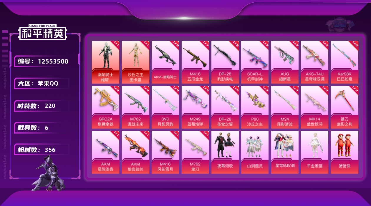 [12553500]素材身法号/老木乃伊/绝世印记3/地铁满天赋/AKM-幽焰骑士(九级)【特价急出/详情看图】:苹果 手Q-2神装-18粉装-20特效枪-6载具-13粉色飞行器-12.9w热力值-18王牌印记-220套装-356枪皮【红色神装等级】:幽焰骑士-维塔(一级),沙丘之主-图卡盟(一级)【热门品类】:粉装-雪国幻梦,粉装-童趣迷兔,套装-浪漫天命,套装-冥河战士,套装-派对舞王,套装-深海小丑鱼,角色-忠猛周仓,角色-忠真马岱,角色-忠义严颜,套装-龟仙人,套装-暗影哥特,套装-红红火火,角色-Mark.06,角色-六号稻草人,熔岩游骑兵面罩,大砍刀-青龙偃月刀,撬棍-龙胆亮银枪,熔岩游骑兵连帽夹克【粉色载具】:宝马M4(圣保罗黄),合金龙骨(蓝),幽焰风驰摩托车,赤兔,照夜玉狮子,护世瑞兽【粉色套装】:粉装-雪国幻梦,粉装-童趣迷兔,粉装-炙焰红王,粉装-山涧鹿灵,粉装-蓝莓炮弹,粉装-暗星紫秘,粉装-焦糖拿铁,角色-小可学妹,粉装-炫光之旅,粉装-莲影清波,粉装-夜幕颂歌,玩偶服-猪猪侠,角色-千金淑猫,角色-月影灵韵,角色-樱桃泡泡,粉装-星穹咏叹调,角色-冷漠罗丽,角色-智趣喵喵【粉色枪皮等级】:AKM-星际浪客(一级),AKM-熔岩统帅(一级),AKM-幽焰骑士(九级),SCAR-L-机甲封神(五级),M416-五爪金龙(七级),M416-风花雪月(一级),GROZA-焦糖拿铁(四级),AUG-超新星(五级),M762-激战未来(四级),M762-鬼刀(一级),AKS-74U-星穹咏叹调(五级),P90-沙丘之主(三级),Kar98K-巳巳如意(五级),M24-莲影清波(三级),Mk14-盛世惊鸿(三级),SVD-月影灵韵(四级),M249-蓝莓炮弹(四级),DP-28-圣堂之誓(四级),DP-28-豹影疾电(五级),镰刀-幽影之判(三级)【粉色飞行器】:酣梦熊熊飞行器,机甲封神飞行器,齐天大圣飞行器,焦糖拿铁飞行器,沙丘之主天马,镜域双华-灵镜之阶,龙翔九天飞行器,幽焰列车飞行器,凤舞九天飞行器,万象金身飞行器,月下星之子飞行器