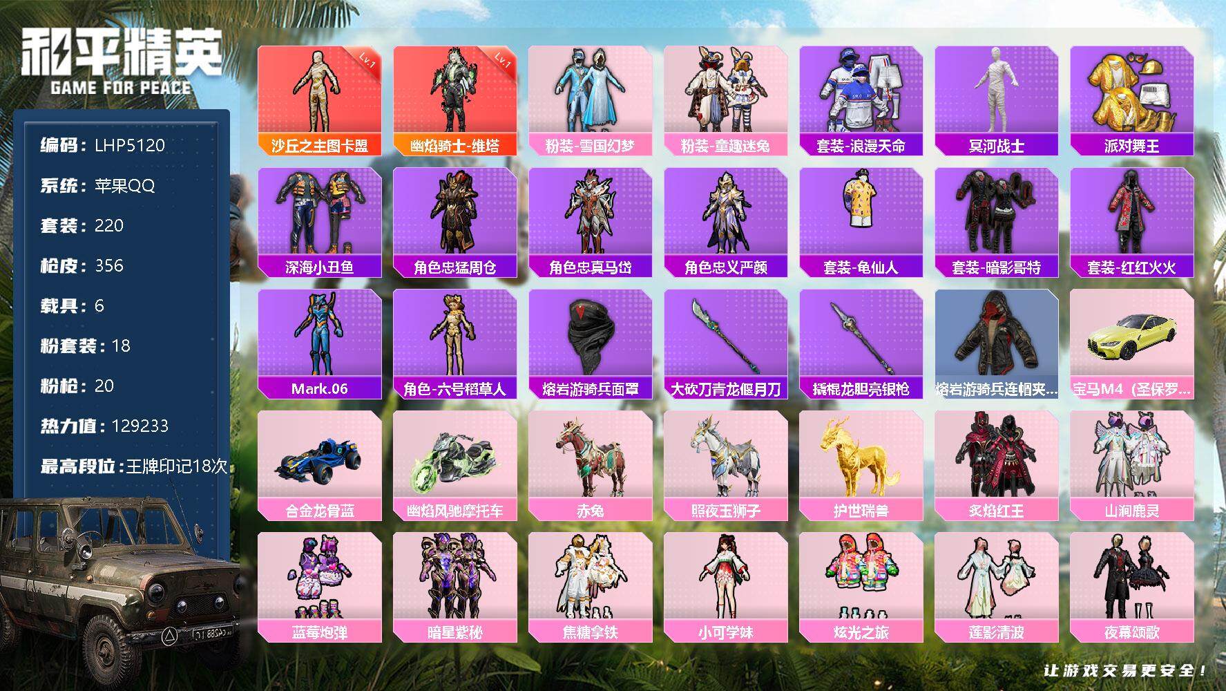 - PX_2094434- 苹果手Q-2王牌印记-1粉装-1特效枪-1载具-30971热力值-88套装-98枪皮-0卓越印记-0传奇印记 【1粉装】,第五大道 【1特效枪】SPAS-12-音爆索尼克-7级 【1稀有紫装】,龟仙人, 【1稀有载具】,宝马M4(圣保罗黄), 【88稀有时装】,SS33特训,彩虹兔,雪绒豹,SS34特训,朱霞炽焰,绛羽幽主,龟仙人,游乐,蜜露汐语,云朵鹅,白糯汤圆,元素星