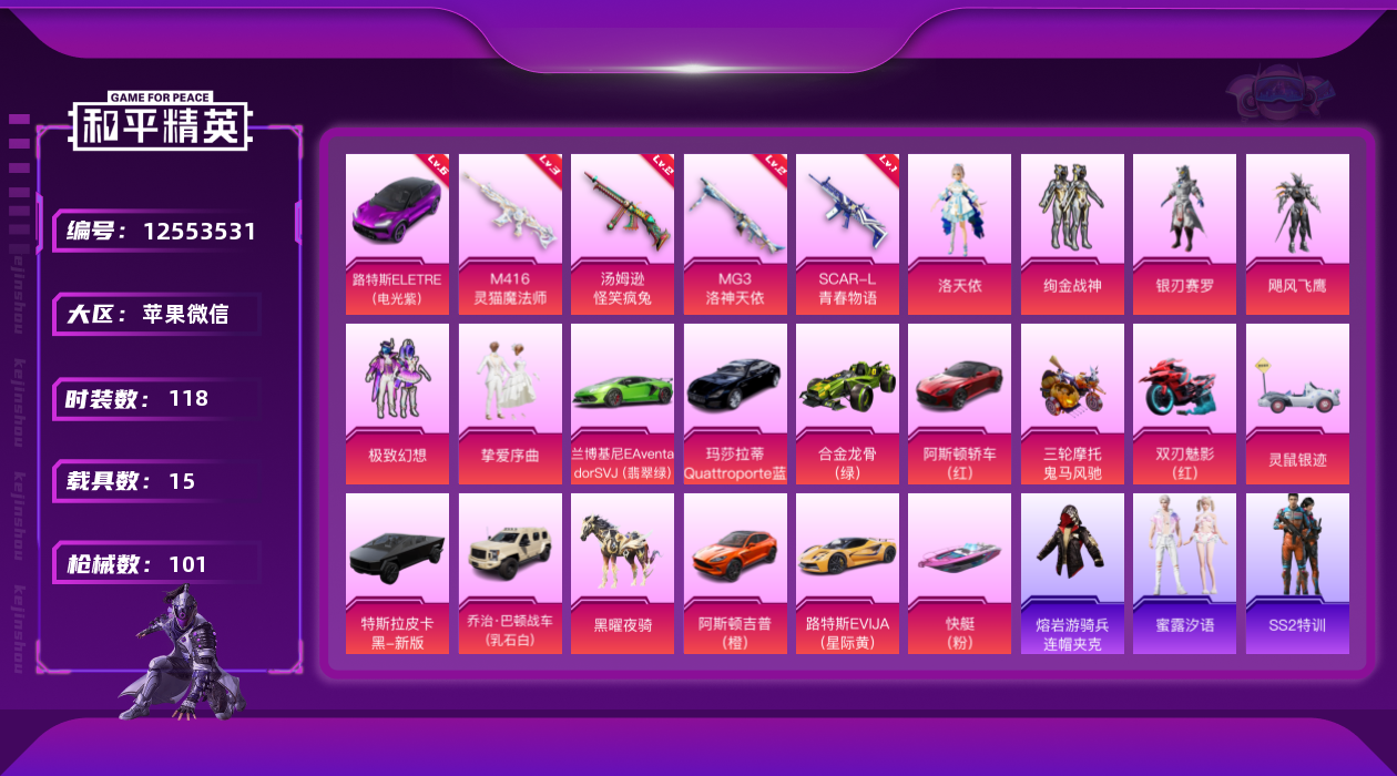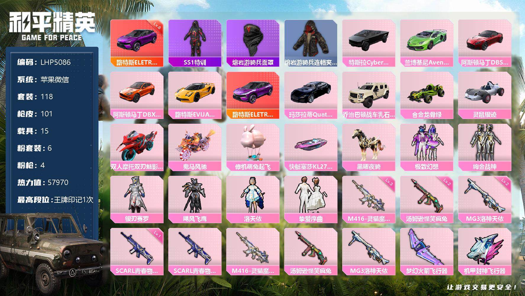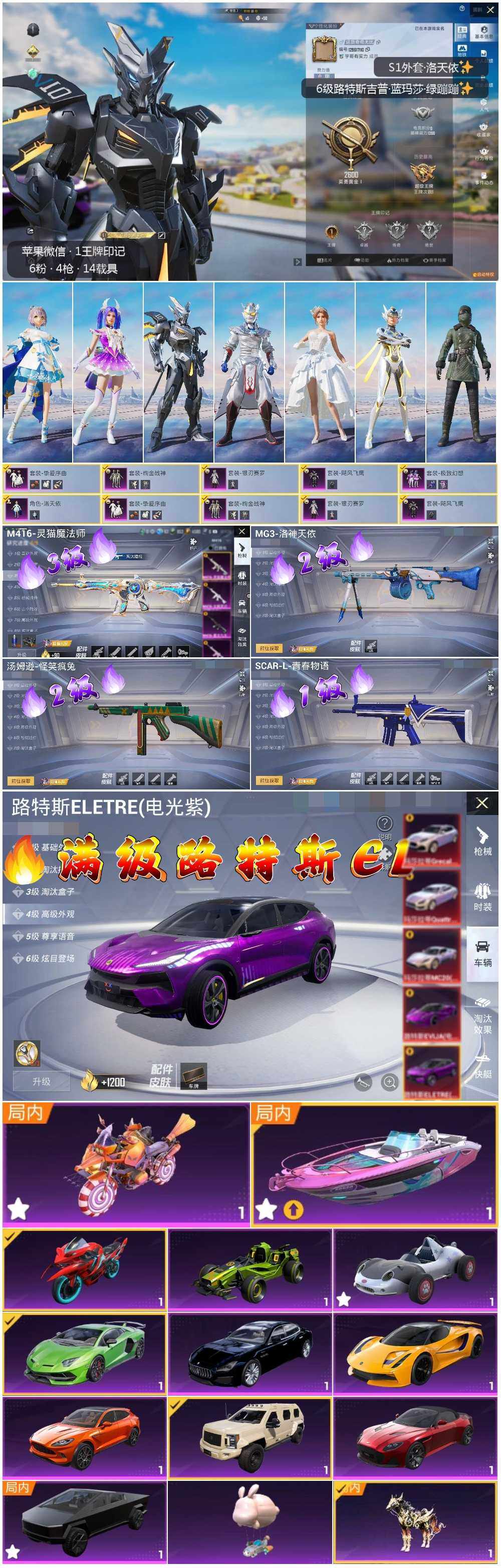 [12553531]素材身法号/路特斯ELETRE(电光紫)(六级)【特价急出/详情看图】:苹果 微信-6粉装-4特效枪-15载具-3粉色飞行器-5.7w热力值-1王牌印记-118套装-101枪皮【红色载具】:路特斯ELETRE(电光紫)(六级)【热门品类】:套装-SS1特训,熔岩游骑兵面罩,熔岩游骑兵连帽夹克【粉色载具】:特斯拉Cybertruck(极昼黑),兰博基尼Aventador SVJ(翡翠绿),阿斯顿马丁DBS(红),阿斯顿马丁DBX(橙),路特斯EVIJA(星际黄),路特斯ELETRE(电光紫),玛莎拉蒂Quattroporte(夜幕蓝),乔治巴顿战车(乳石白),合金龙骨(绿),灵鼠银迹,双人摩托-双刃魅影(红),鬼马风驰,僚机-萌兔起飞,快艇-塞莎KL27(霓虹粉),黑曜夜骑【粉色套装】:粉装-极致幻想,粉装-绚金战神,粉装-银刃赛罗,粉装-飓风飞鹰,角色-洛天依,粉装-挚爱序曲【粉色枪皮等级】:SCAR-L-青春物语(一级),M416-灵猫魔法师(三级),汤姆逊-怪笑疯兔(二级),MG3-洛神天依(二级)【粉色飞行器】:梦幻火箭飞行器,机甲封神飞行器,灵猫魔法师飞行器