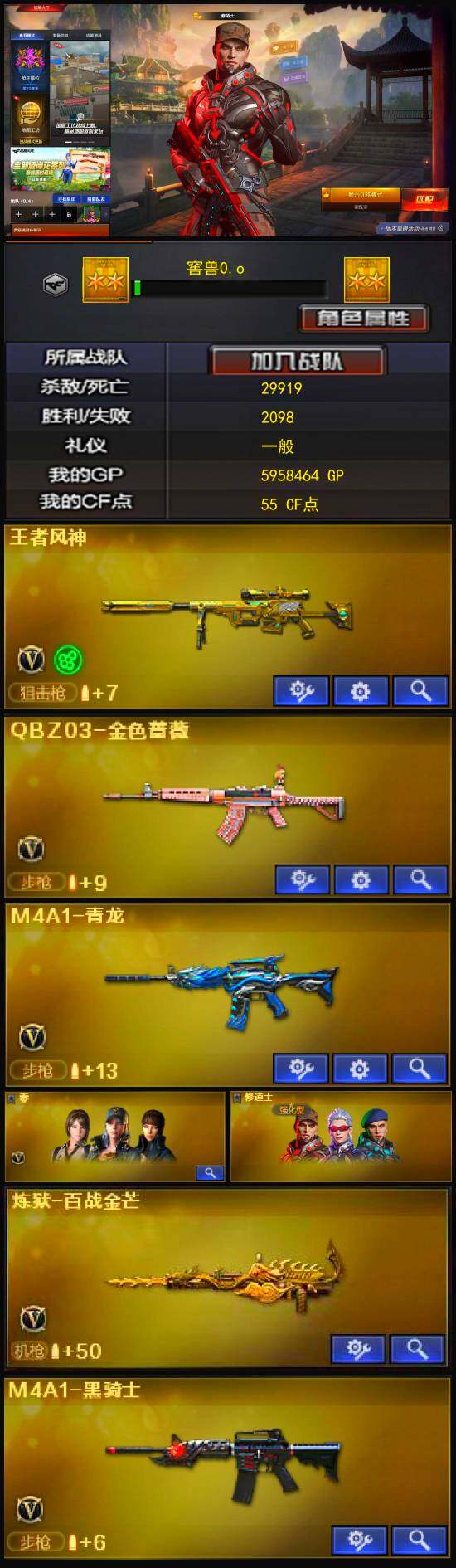 - [12165524]【商品标题】:北方大区-34V-1王者-0炫金 【热门武器】:QBZ03-金色蔷薇,Cat-刀锋 【王者炫金武器】:王者星霆 【音效卡】:Scar Light-白虎-热带奇洋音效卡 【稀有皮肤】:屠龙-星火燎原 【角色】:零-水下丽影,战地猎狐 【人偶武器】:Cat-刀锋,灵狐娃娃手雷 【挑战大师】:试炼破坏者III 【英雄级武器】:QBZ03-云龙,COP 357-云龙,斩神刀-雷暴,QBZ03-金色蔷薇,M4A1-雷神,Barrett-极光,黑武士-锦绣游龙,超新星-热带奇洋,M4A1-赤狱骑士,沙鹰-天神,屠龙,龙啸-热带奇洋 【特殊枪械】: