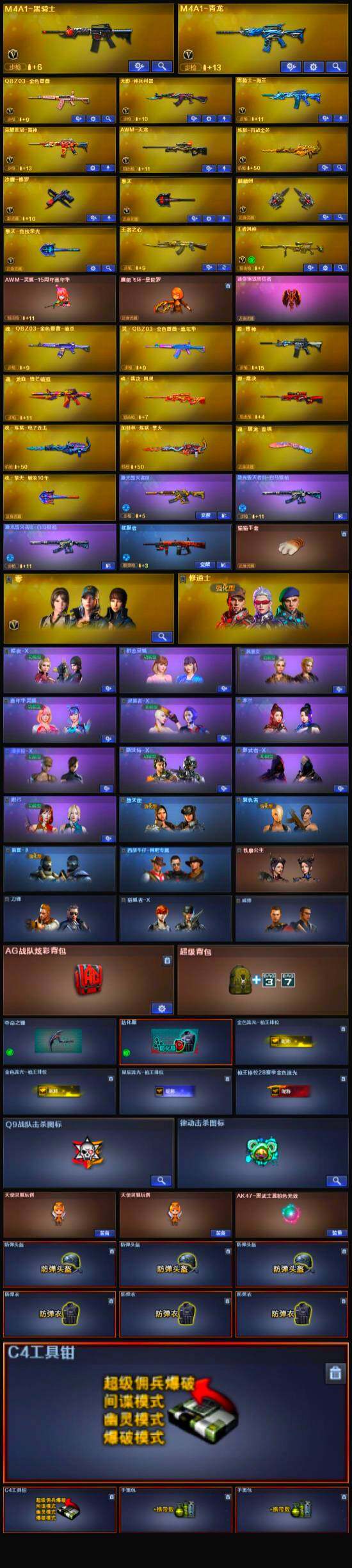 【英雄级武器】:擎天-竞技荣光,荣耀世冠-雷神,QBZ03-金色蔷薇,M4A1-青龙,无影-神兵利器,M4A1-黑骑士,AWM-天龙,黑骑士-海王,沙鹰-修罗,麒麟刺,擎天
