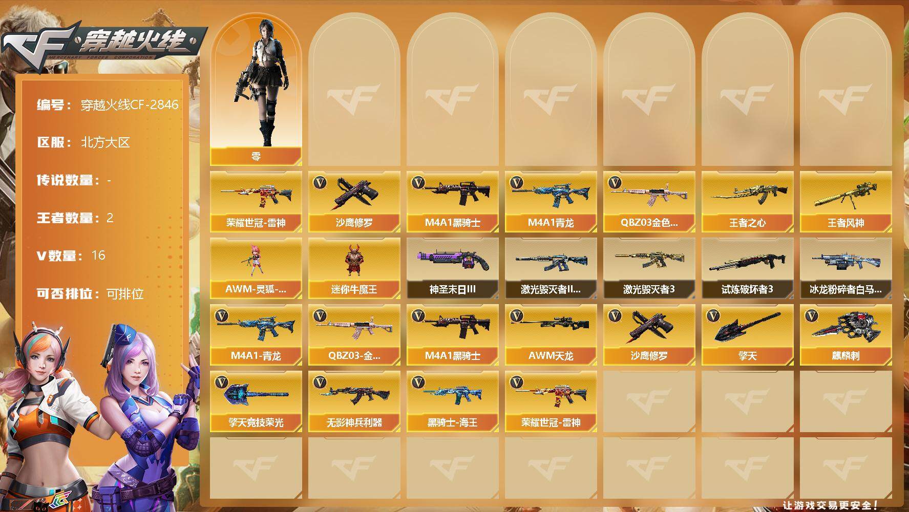 [12554415]【商品标题】:北方大区-16V-2王者-0炫金 【热门武器】:QBZ03-金色蔷薇,M4A1-青龙,荣耀世冠-雷神,M4A1-黑骑士,沙鹰-修罗 【王者炫金武器】:王者之心,王者风神 【角色】:零 【人偶武器】:AWM-灵狐-15周年嘉年华,迷你牛魔王 【挑战大师】:神圣爆裂者-末日III,试炼破坏者III,激光毁灭者III,激光毁灭者III-白马银枪*2,冰龙粉碎者-白马银枪*2 【英雄级武器】:擎天-竞技荣光,荣耀世冠-雷神,QBZ03-金色蔷薇,M4A1-青龙,无影-神兵利器,M4A1-黑骑士,AWM-天龙,黑骑士-海王,沙鹰-修罗,麒麟刺,擎天 【特殊枪械】:1黑骑士