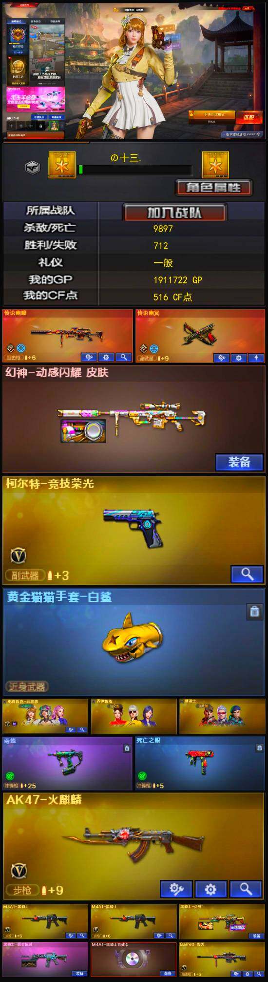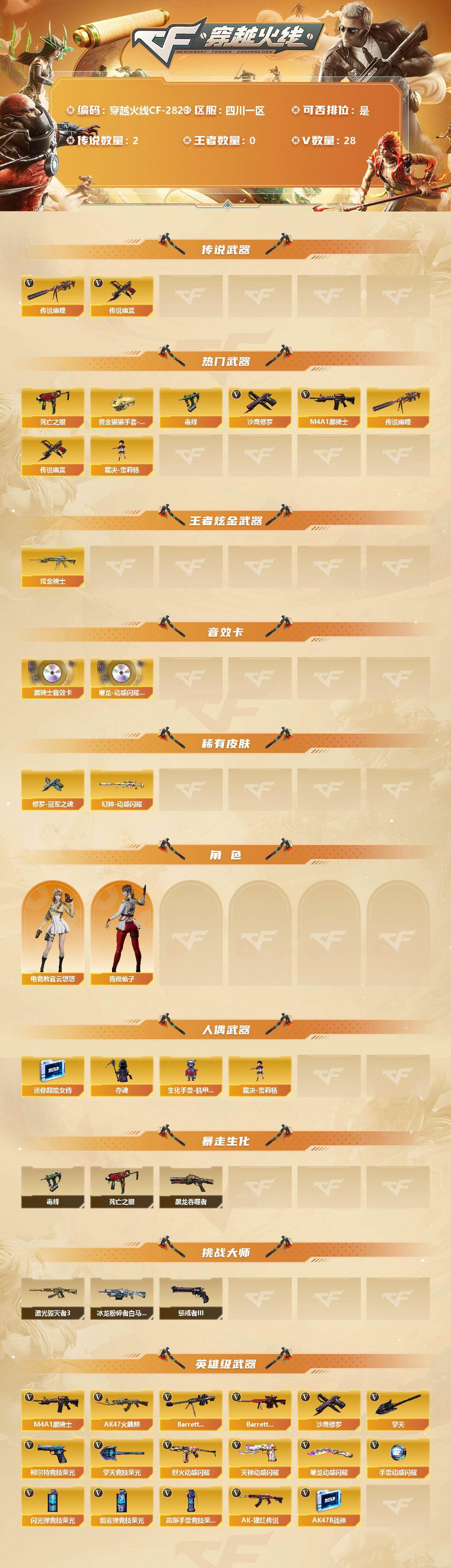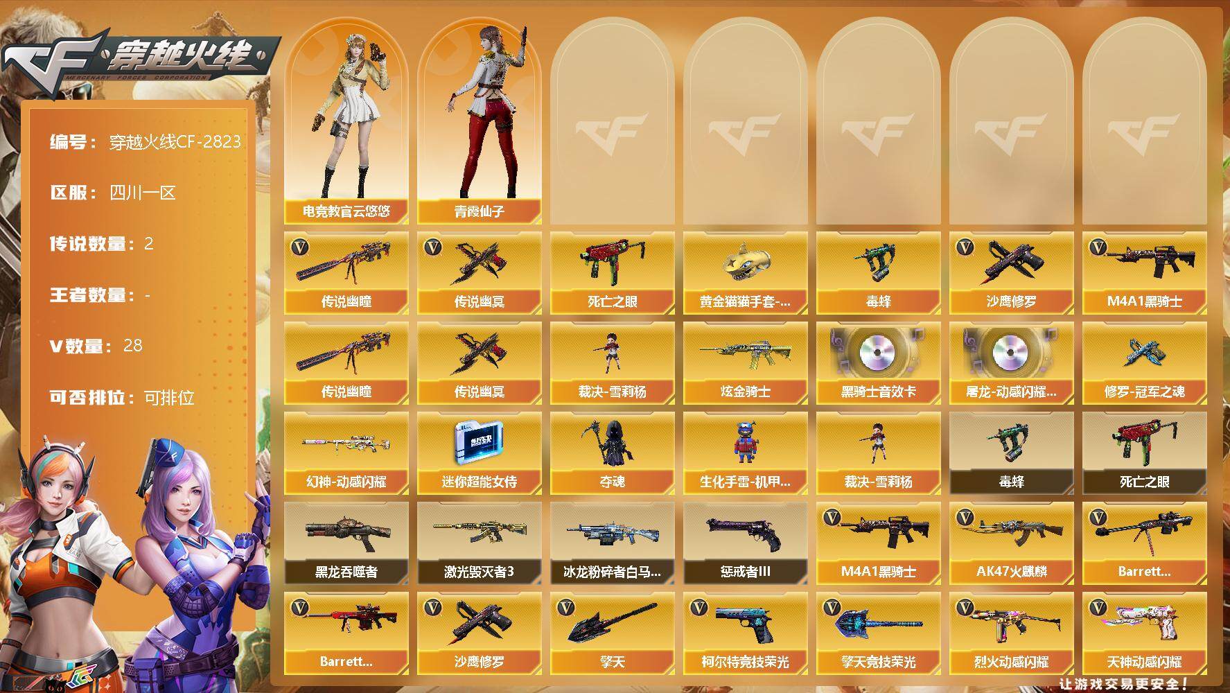 [12554049]【商品标题】:四川一区-28V-0王者-1炫金 【传说武器】:传说幽瞳,传说幽冥 【热门武器】:传说幽瞳,传说幽冥,死亡之眼,毒蜂,M4A1-黑骑士*2,裁决-雪莉杨,沙鹰-修罗,黄金猫猫手套-白鲨 【王者炫金武器】:炫金骑士 【音效卡】:屠龙-动感闪耀 音效卡,M4A1-黑骑士音效卡 【稀有皮肤】:幻神-动感闪耀 皮肤,修罗-冠军之魂 【角色】:电竞教官-云悠悠,青霞仙子 【人偶武器】:裁决-雪莉杨,迷你超能女侍,夺魂,生化手雷-机甲核心 【暴走生化】:毒蜂,死亡之眼,黑龙吞噬者 【挑战大师】:惩戒者III,激光毁灭者III,冰龙粉碎者-白马银枪*2 【英雄级武器】:柯尔特-竞技荣光,擎天-竞技荣光,高爆手雷-竞技荣光*4,烟雾弹-竞技荣光*2,闪光弹-竞技荣光*3,烈火-动感闪耀,天神-动感闪耀,屠龙-动感闪耀,手雷-动感闪耀,M4A1-黑骑士*2,AK47-火麒麟,Barrett-毁灭,Barrett-极光,AK-47-猩红传说,AK47-B-战神,沙鹰-修罗,擎天*2 【特殊枪械】:2黑骑士