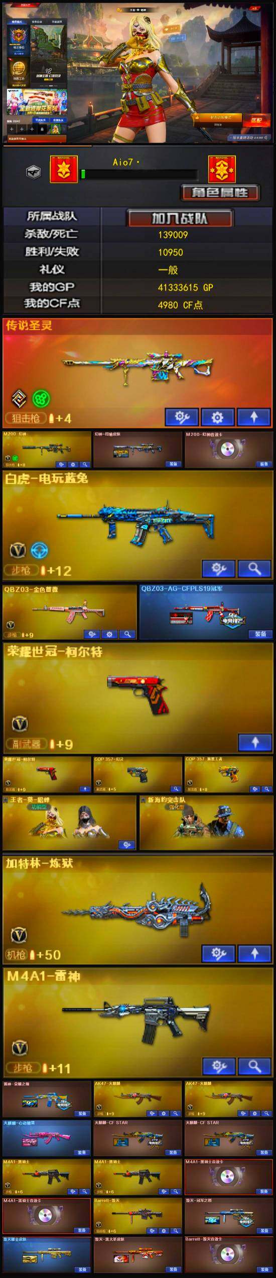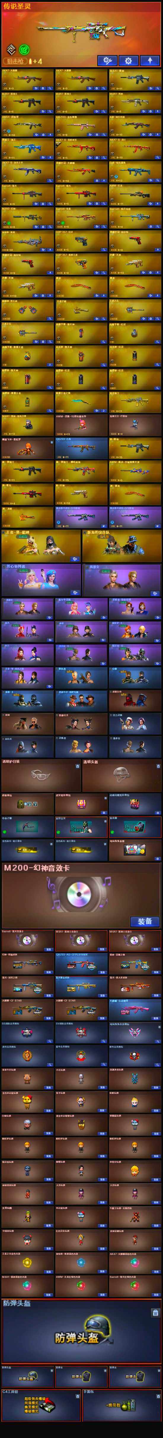【英雄级武器】:COP 357-幻灵,麒麟刺-堕天神,荣耀世冠-火麒麟,荣耀世冠-柯尔特*2,QBZ03-金色蔷薇,白虎-电玩蓝兔,无影-神兵利器,M4A1-雷神,M4A1-黑骑士*2,M4A1-死神,加特林-炼狱,AK47-火麒麟*2,AN94-超新星,AWM-天龙,Barrett-毁灭,Barrett-极光,Barrett-朱雀,M200-幻神,黑骑士-海王,AK-47-猩红传说,AK47-B-常胜将军,沙鹰-天神*2,屠龙*2