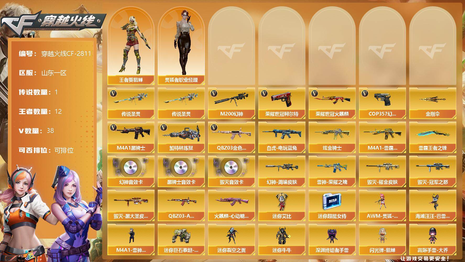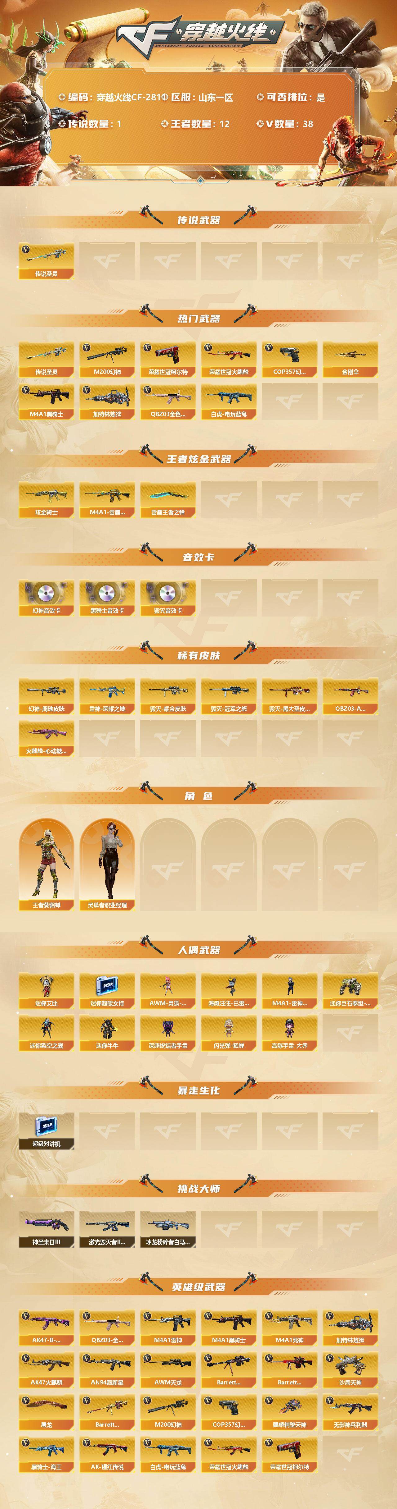 [12553752]【商品标题】:山东一区-38V-12王者-1炫金 【传说武器】:传说圣灵 【热门武器】:传说圣灵,QBZ03-金色蔷薇,M200-幻神,荣耀世冠-火麒麟,白虎-电玩蓝兔,荣耀世冠-柯尔特*2,M4A1-黑骑士*2,加特林-炼狱,COP 357-幻灵,金刚伞 【王者炫金武器】:炫金骑士,M4A1-雷霆王者,雷霆王者之锋 【音效卡】:M200-幻神音效卡,M4A1-黑骑士音效卡*2,Barrett-毁灭音效卡 【稀有皮肤】:幻神-周瑜皮肤,QBZ03-AG-CFPLS19冠军,雷神-荣耀之魄,火麒麟-心动糖果,毁灭耀金皮肤,毁灭-冠军之怒,毁灭-黑大圣皮肤 【角色】:王者-葵-貂蝉,灵狐者-职业经理 【人偶武器】:AWM-灵狐-15周年嘉年华,海滩汪汪-巴雷特,M4A1-雷神-精英刀锋,迷你艾比,迷你超能女侍,迷你巨石泰坦-魔花研究所,迷你裂空之翼,迷你牛牛,深渊终结者手雷,闪光弹-貂蝉,高爆手雷-大乔 【暴走生化】:超级对讲机 【挑战大师】:神圣爆裂者-末日III,激光毁灭者III-白马银枪*2,冰龙粉碎者-白马银枪 【英雄级武器】:COP 357-幻灵,麒麟刺-堕天神,荣耀世冠-火麒麟,荣耀世冠-柯尔特*2,QBZ03-金色蔷薇,白虎-电玩蓝兔,无影-神兵利器,M4A1-雷神,M4A1-黑骑士*2,M4A1-死神,加特林-炼狱,AK47-火麒麟*2,AN94-超新星,AWM-天龙,Barrett-毁灭,Barrett-极光,Barrett-朱雀,M200-幻神,黑骑士-海王,AK-47-猩红传说,AK47-B-常胜将军,沙鹰-天神*2,屠龙*2 【特殊枪械】:2黑骑士,1炼狱