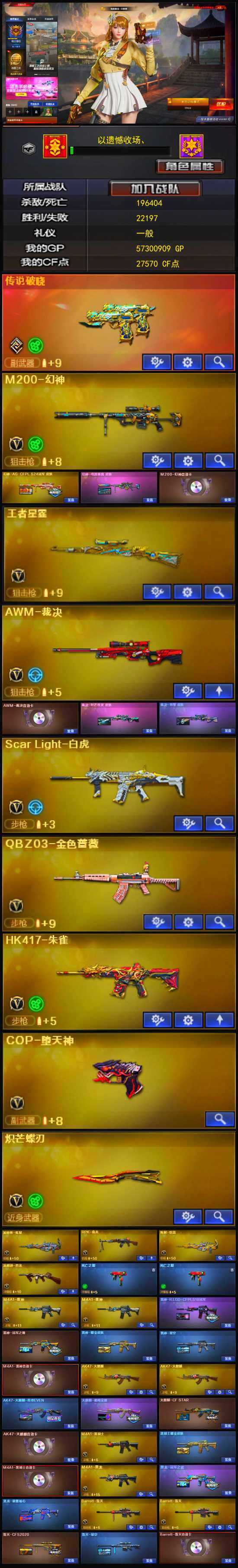 【热门武器】:传说破晓,QBZ03-金色蔷薇,Scar Light-白虎,HK417-朱雀,M200-幻神,死亡之眼*2,C.A.T,M4A1-黑骑士,汤姆逊-烈龙,RPK-盘龙,加特林-炼狱,COP-白鲨,COP-堕天神,沙鹰-修罗*4,炽芒蝶刃,金刚伞