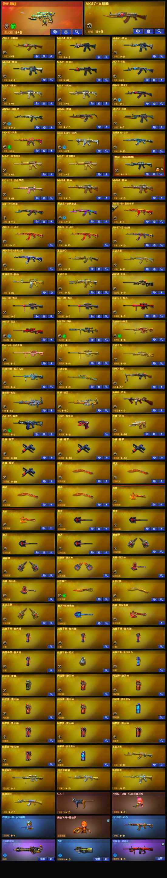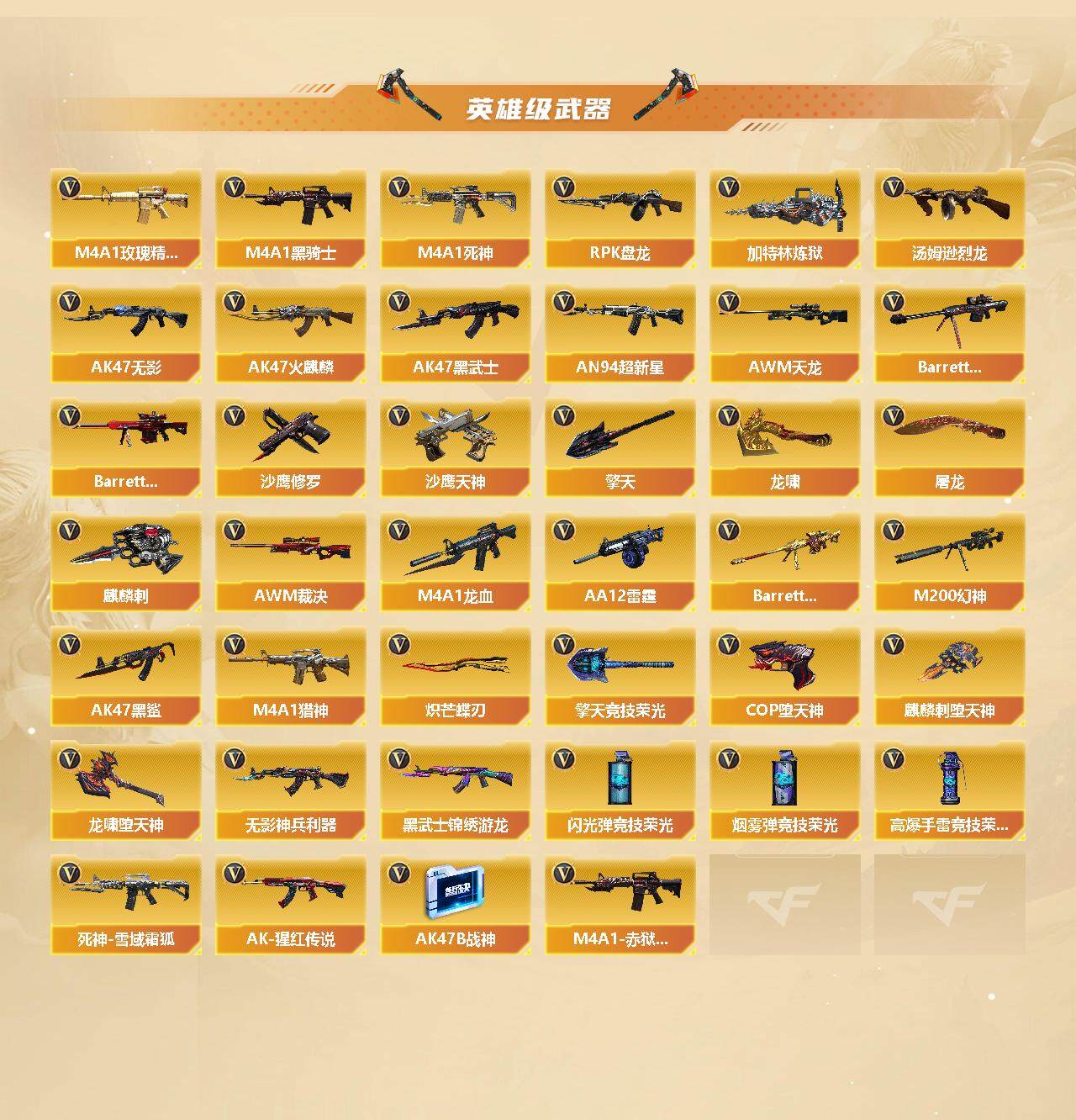 【英雄级武器】:擎天-竞技荣光,高爆手雷-竞技荣光,烟雾弹-竞技荣光,闪光弹-竞技荣光,COP-堕天神,麒麟刺-堕天神,龙啸-堕天神*2,QBZ03-金色蔷薇,Scar Light-白虎,HK417-朱雀,无影-神兵利器,M4A1-雷神*2,M4A1-黑龙,M4A1-玫瑰精灵*2,M4A1-黑骑士,M4A1-死神*2,RPK-盘龙,加特林-炼狱,汤姆逊-烈龙,AK47-无影,AK47-火麒麟*2,AK47-黑武士,AN94-超新星,AWM-天龙,Barrett-毁灭*2,Barrett-极光,AWM-裁决,M4A1-龙血,AA-12-雷霆,Barrett-朱雀,M200-幻神,AK47-黑鲨,M4A1-猎神*2,黑武士-锦绣游龙,死神-雪域霜狐,AK-47-猩红传说*6,