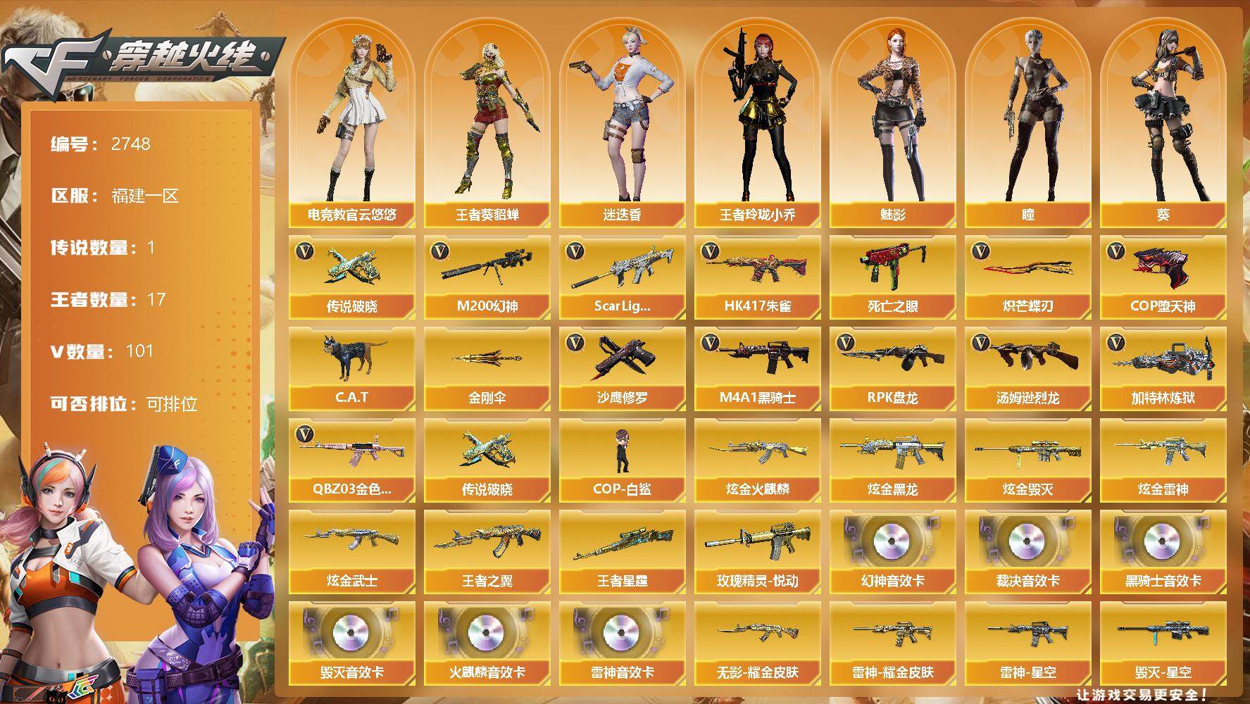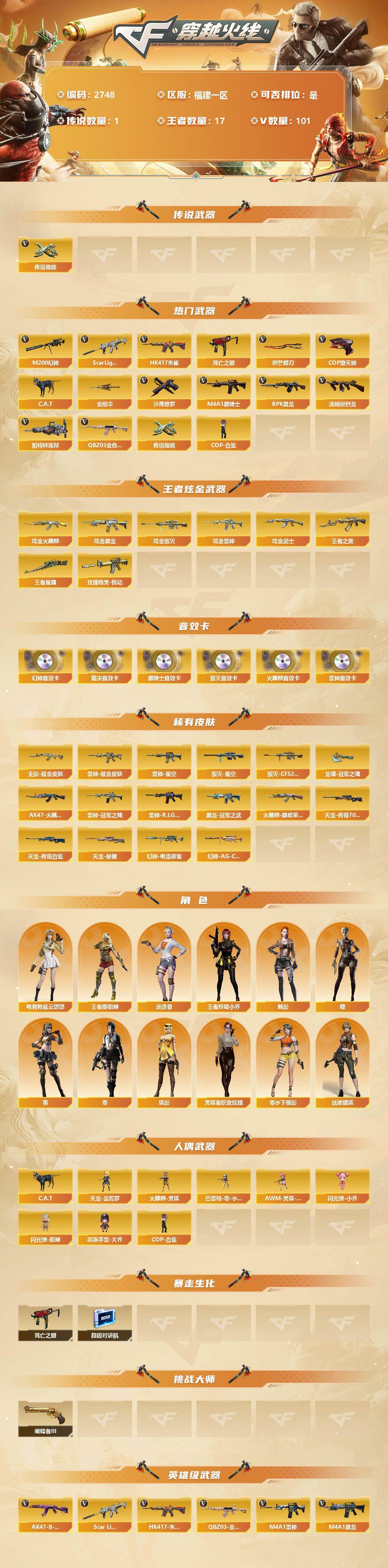 [12554563]【商品标题】:福建一区-101V-17王者-5炫金 【传说武器】:传说破晓 【热门武器】:传说破晓,QBZ03-金色蔷薇,Scar Light-白虎,HK417-朱雀,M200-幻神,死亡之眼*2,C.A.T,M4A1-黑骑士,汤姆逊-烈龙,RPK-盘龙,加特林-炼狱,COP-白鲨,COP-堕天神,沙鹰-修罗*4,炽芒蝶刃,金刚伞 【王者炫金武器】:炫金火麒麟,炫金黑龙,炫金毁灭,炫金雷神,炫金武士,王者之翼,玫瑰精灵-悦动,王者星霆 【音效卡】:M200-幻神音效卡,AK47-火麒麟音效卡,M4A1-雷神音效卡,M4A1-黑骑士音效卡,Barrett-毁灭音效卡,AWM-裁决音效卡 【稀有皮肤】:幻神-电流骇客 皮肤,幻神-AG-CFPL S24冠军 皮肤,雷神-星空,雷神-耀金皮肤,雷神-冠军之魄,雷神-R.LGD-CFPLS18冠军,AK47-火麒麟-传奇EVEN,火麒麟-巅峰荣耀,黑龙-冠军之武,毁灭-星空,毁灭-CFS2020,天龙-秘银*2,AWM-天龙-传奇70KG,AWM-天龙-传奇白鲨,无影耀金皮肤,龙啸-冠军之啸 【角色】:王者-葵-貂蝉,王者玲珑-小乔,狐影,零-水下丽影,灵狐者-职业经理,零,葵,瞳,魅影,迷迭香,电竞教官-云悠悠,战地猎狐 【人偶武器】:COP-白鲨,天龙-曼陀罗,火麒麟-灵狐*2,巴雷特-零-水下丽影,AWM-灵狐-15周年嘉年华,C.A.T,闪光弹-小乔,闪光弹-貂蝉,高爆手雷-大乔 【暴走生化】:死亡之眼*2,超级对讲机 【挑战大师】:阐释者III 【英雄级武器】:擎天-竞技荣光,高爆手雷-竞技荣光,烟雾弹-竞技荣光,闪光弹-竞技荣光,COP-堕天神,麒麟刺-堕天神,龙啸-堕天神*2,QBZ03-金色蔷薇,Scar Light-白虎,HK417-朱雀,无影-神兵利器,M4A1-雷神*2,M4A1-黑龙,M4A1-玫瑰精灵*2,M4A1-黑骑士,M4A1-死神*2,RPK-盘龙,加特林-炼狱,汤姆逊-烈龙,AK47-无影,AK47-火麒麟*2,AK47-黑武士,AN94-超新星,AWM-天龙,Barrett-毁灭*2,Barrett-极光,AWM-裁决,M4A1-龙血,AA-12-雷霆,Barrett-朱雀,M200-幻神,AK47-黑鲨,M4A1-猎神*2,黑武士-锦绣游龙,死神-雪域霜狐,AK-47-猩红传说*6,