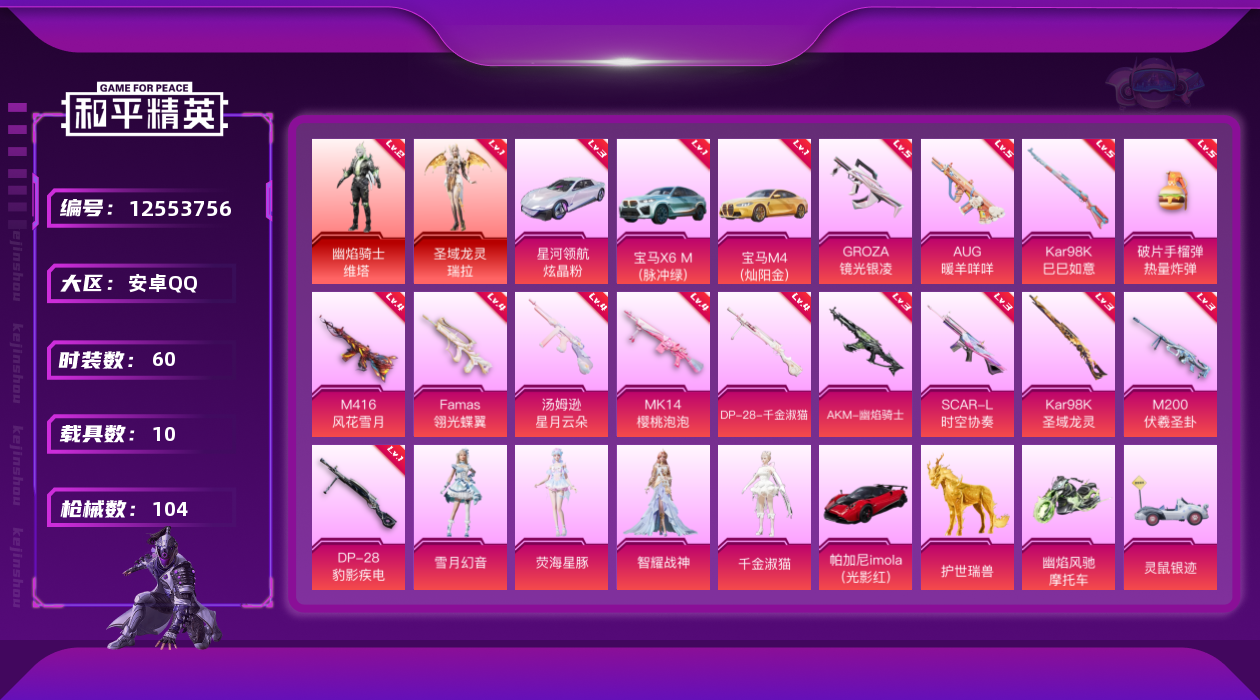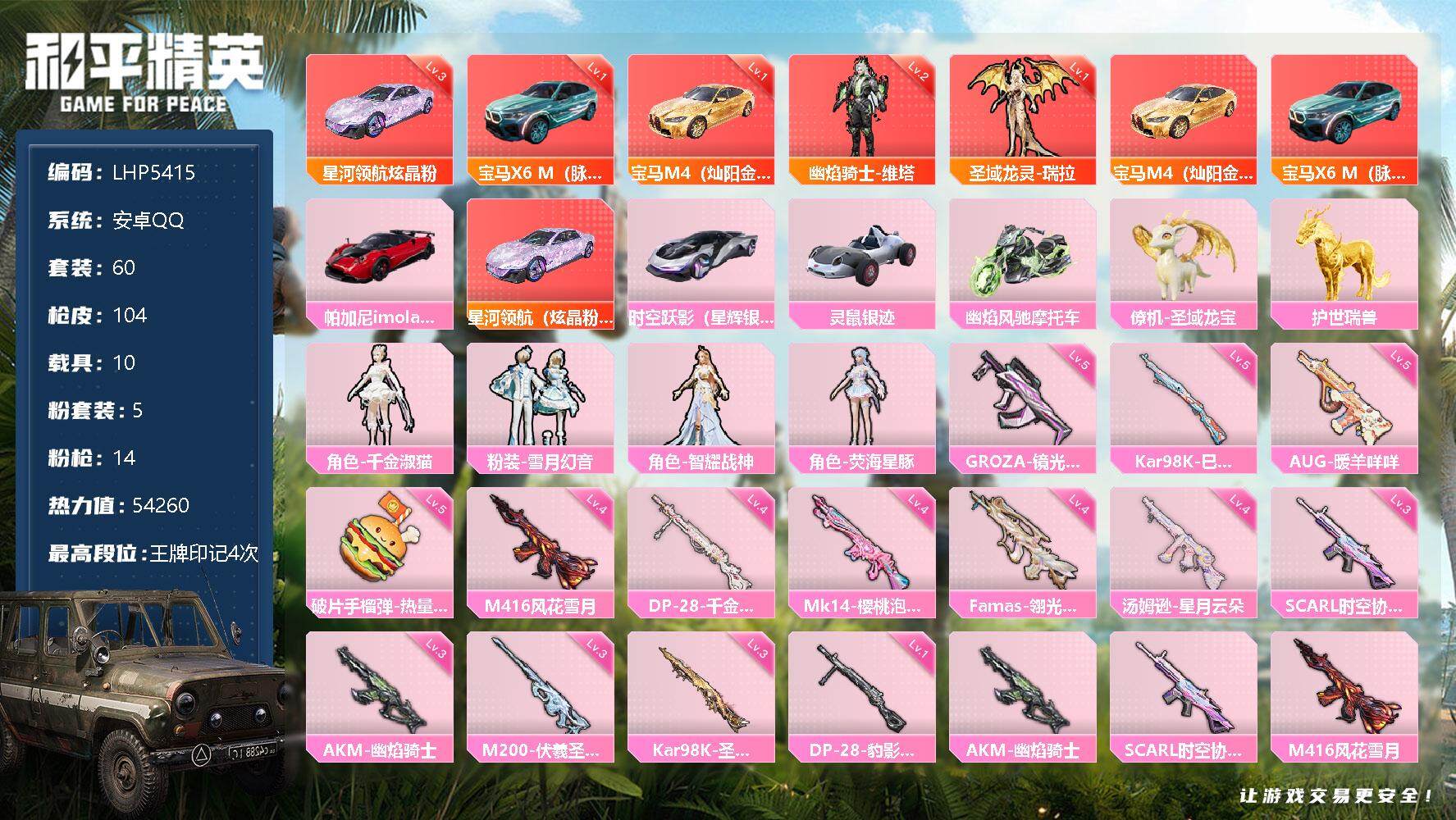 [12553756]素材身法号/绝世印记1【特价急出/详情看图】:安卓 手Q-2神装-5粉装-14特效枪-10载具-4粉色飞行器-5.4w热力值-4王牌印记-60套装-104枪皮【红色载具】:星河领航(炫晶粉)(三级),宝马X6 M(脉冲绿)(一级),宝马M4(灿阳金)(一级)【红色神装等级】:圣域龙灵-瑞拉(一级),幽焰骑士-维塔(二级)【粉色载具】:宝马M4(灿阳金),宝马X6 M(脉冲绿),帕加尼imola(光影红),星河领航(炫晶粉),时空跃影(星辉银),灵鼠银迹,幽焰风驰摩托车,僚机-圣域龙宝,护世瑞兽【粉色套装】:角色-千金淑猫,粉装-雪月幻音,角色-智耀战神,角色-荧海星豚【粉色枪皮等级】:AKM-幽焰骑士(三级),SCAR-L-时空协奏(三级),M416-风花雪月(四级),GROZA-镜光银凌(五级),AUG-暖羊咩咩(五级),Famas-翎光蝶翼(四级),汤姆逊-星月云朵(四级),Kar98K-巳巳如意(五级),Kar98K-圣域龙灵(三级),Mk14-樱桃泡泡(四级),M200-伏羲圣卦(三级),DP-28-千金淑猫(四级),DP-28-豹影疾电(一级),破片手榴弹-热量炸弹(五级)【粉色飞行器】:时空协奏飞行器,幽焰列车飞行器,万象金身飞行器,圣域金龙飞行器