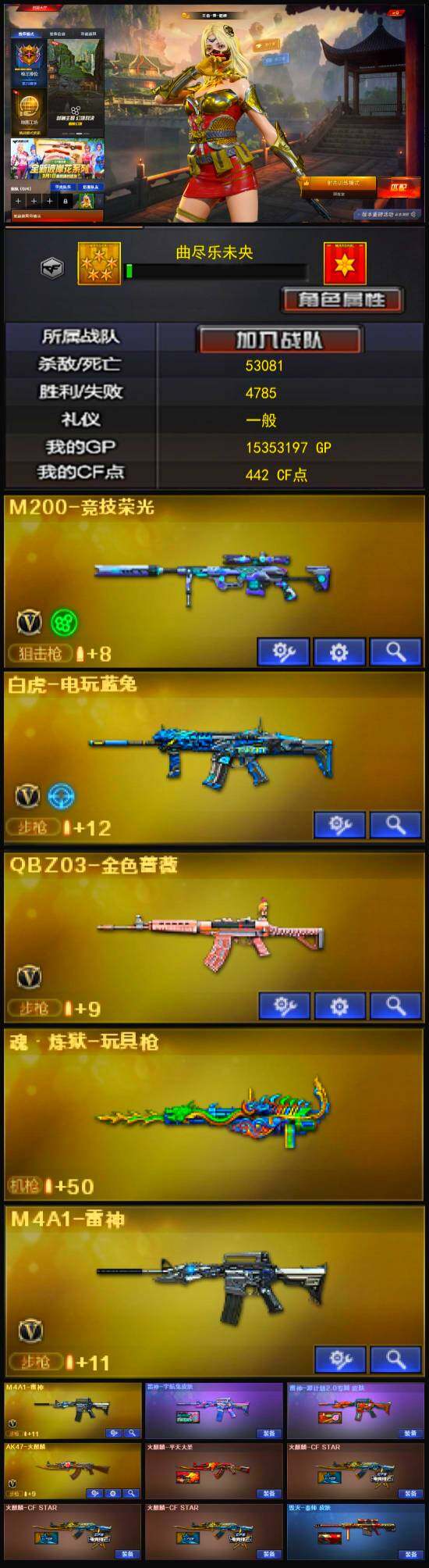 - [13752316]广东一区-70V-0王者-0炫金 【热门武器】:QBZ03-金色蔷薇,M200-幻神,M200-竞技荣光,M4A1-黑骑士,羊驼玩偶,USP-雷暴,COP-堕天神 【音效卡】:炼狱-百战金芒-庆典舞曲音效卡 【皮肤】:M4A1-再燃火线,雷神-神秘按键 皮肤,火麒麟-平天大圣,火麒麟-百城,战神-粉色甜心皮肤*2,战神-紫绶金章皮肤*2,极光-高能霹雳 皮肤*2,轻型军用手斧-再燃火线 【角色】:电竞教官-云悠悠,乔伊教练,修道士,初恋灵狐,芳心审判者,风暴女,嘉年华灵狐,灵狐者-七夕宝贝,龙儿,曼陀罗-礼服,潘多拉-X,潘多拉-甜心教官,青霞仙子,雪莉杨-摸金校尉 【人偶武器】:AWM-灵狐-15周年嘉年华*2,夺魂,闪光弹-貂蝉 【挑战大师】:VEPR-12-金魔 【英雄级武器】:AK47-火麒麟,M4A1-雷神,M4A1-黑骑士,无影-神兵利器,QBZ03-云龙,黑武士-锦绣游龙,QBZ03-金色蔷薇,AK-47-猩红传说*2,AK47-B-常胜将军,Barrett-极光,M200-幻神,M200-竞技荣光,炼狱-百战金芒,USP-雷暴,COP-堕天神,柯尔特-竞技荣光,破空枪刃-夜魔,马来剑-夜魔,擎天-竞技荣光*2,麒麟刺-百战金芒,高爆手雷-夜魔*4,高爆手雷-竞技荣光*9,高爆手雷-云龙,闪光弹-夜魔*4,闪光弹-竞技荣光*8,闪光弹-云龙,烟雾弹-夜魔*4,烟雾弹-竞技荣光*9,M4A1-苍鸣雷神 【道具】:BS战队炫彩背包,亚洲杯纪念炫彩背包,百战金芒炫彩背包,超级背包,女皇终结者-魔龙之吻,绿色巨人,灵魂忍者,迷雾幽灵,夺命之镰,防化服*3,金色流光-枪王排位,星辰流光-枪王排位,枪王排位28赛季金色流光,语音特效-盛典烟火,萌萌小葵表情,防弹头盔*3,防弹衣*3,C4工具钳*3,手雷包*3 【特殊枪械】:1黑骑士