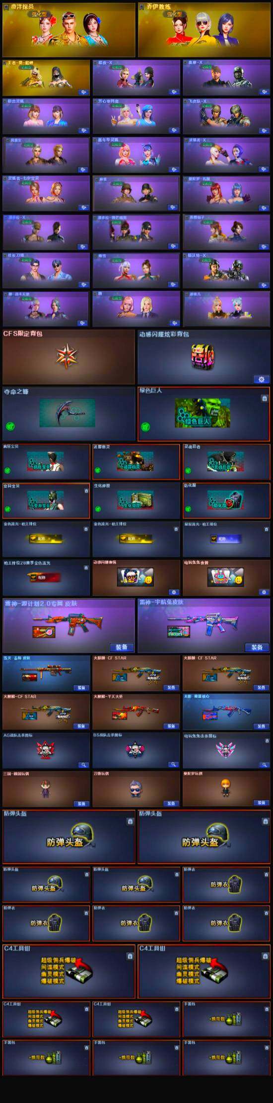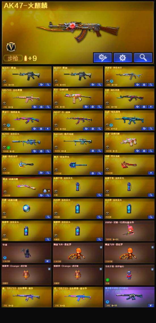 【英雄级武器】:M200-竞技荣光,擎天-竞技荣光,高爆手雷-竞技荣光*2,烟雾弹-竞技荣光*2,闪光弹-竞技荣光*2,烈火-动感闪耀,天神-动感闪耀,屠龙-动感闪耀,手雷-动感闪耀,QBZ03-金色蔷薇,白虎-电玩蓝兔,无影-神兵利器,M4A1-雷神*2,AK47-火麒麟,黑武士-锦绣游龙,超新星-热带奇洋,AK-47-猩红传说*4,AK47-B-战神,龙啸-热带奇洋