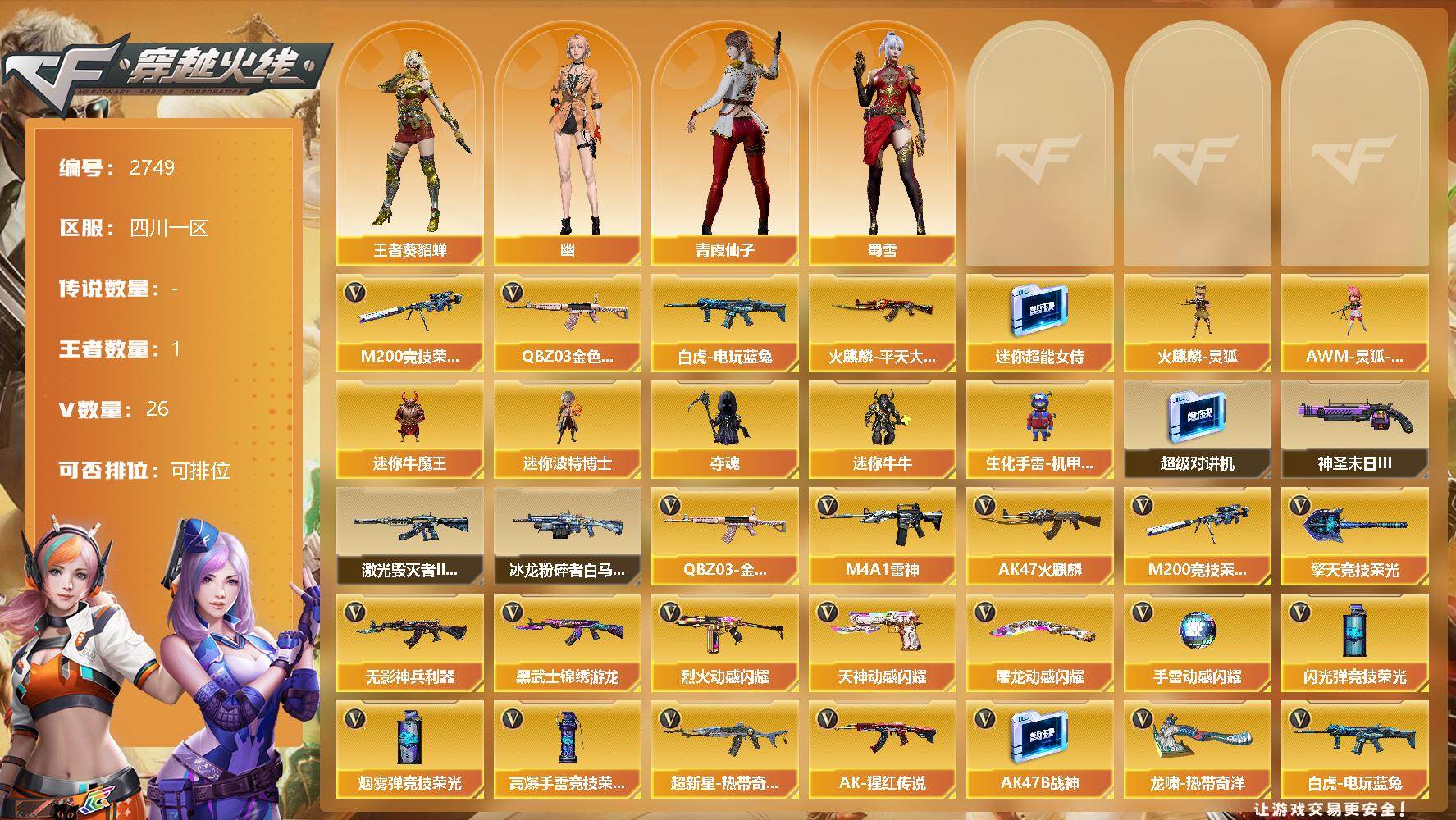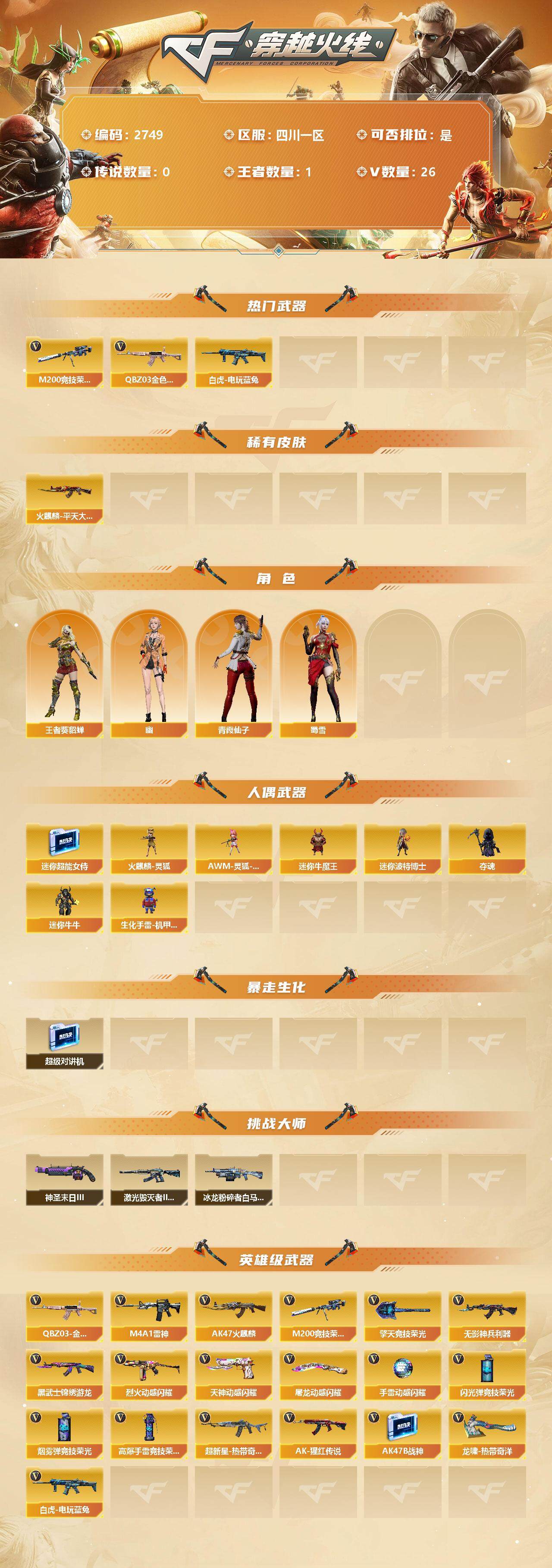 [12554787]【商品标题】:四川一区-26V-1王者-0炫金 【热门武器】:QBZ03-金色蔷薇,M200-竞技荣光,白虎-电玩蓝兔 【稀有皮肤】:火麒麟-平天大圣*2 【角色】:王者-葵-貂蝉,幽,蜀雪,青霞仙子 【人偶武器】:火麒麟-灵狐,AWM-灵狐-15周年嘉年华,迷你超能女侍,迷你牛魔王,迷你波特博士,夺魂,迷你牛牛,生化手雷-机甲核心 【暴走生化】:超级对讲机 【挑战大师】:神圣爆裂者-末日III,激光毁灭者III-白马银枪,冰龙粉碎者-白马银枪 【英雄级武器】:M200-竞技荣光,擎天-竞技荣光,高爆手雷-竞技荣光*2,烟雾弹-竞技荣光*2,闪光弹-竞技荣光*2,烈火-动感闪耀,天神-动感闪耀,屠龙-动感闪耀,手雷-动感闪耀,QBZ03-金色蔷薇,白虎-电玩蓝兔,无影-神兵利器,M4A1-雷神*2,AK47-火麒麟,黑武士-锦绣游龙,超新星-热带奇洋,AK-47-猩红传说*4,AK47-B-战神,龙啸-热带奇洋 【特殊枪械】:
