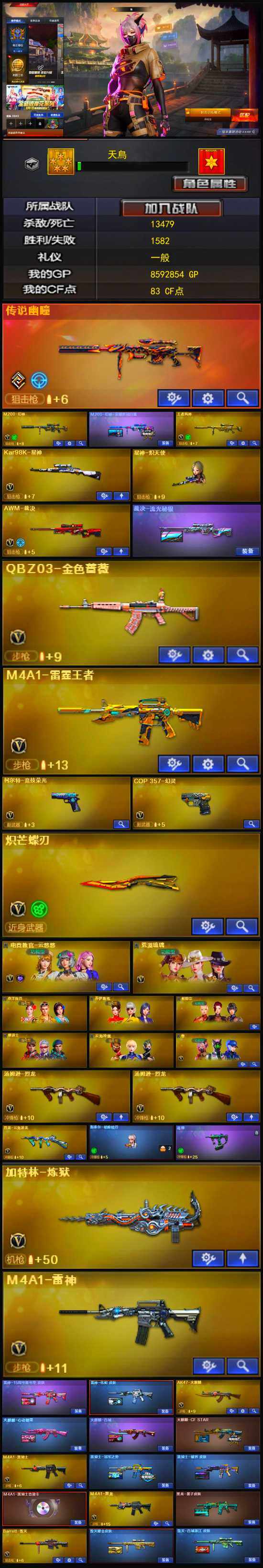 【热门武器】:传说幽瞳,QBZ03-金色蔷薇,M200-幻神,金色蔷薇-古蛇迷踪,修罗-古蛇迷踪,Kar98K-星神,毒蜂,M4A1-黑骑士,汤姆逊-烈龙*2,加特林-炼狱,COP 357-幻灵,沙鹰-修罗*3,炽芒蝶刃
