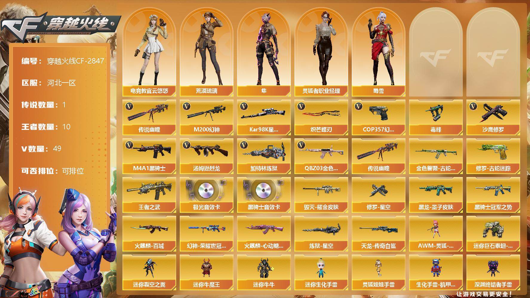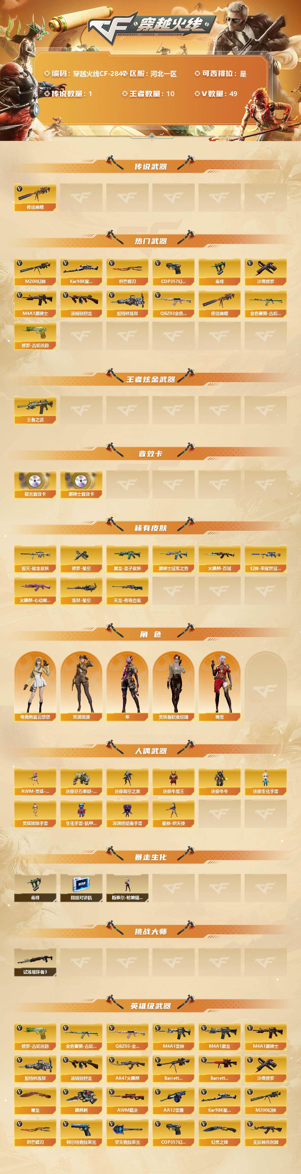 [12554748]【商品标题】:河北一区-49V-10王者-0炫金 【传说武器】:传说幽瞳 【热门武器】:传说幽瞳,QBZ03-金色蔷薇,M200-幻神,金色蔷薇-古蛇迷踪,修罗-古蛇迷踪,Kar98K-星神,毒蜂,M4A1-黑骑士,汤姆逊-烈龙*2,加特林-炼狱,COP 357-幻灵,沙鹰-修罗*3,炽芒蝶刃 【王者炫金武器】:王者之武 【音效卡】:M4A1-黑骑士音效卡,Barrett-极光音效卡 【稀有皮肤】:M200-幻神-荣耀世冠白鲨,火麒麟-百城,火麒麟-心动糖果,黑骑士-冠军之势,黑龙-墨子皮肤,炼狱-星空,毁灭耀金皮肤,AWM-天龙-传奇白鲨,修罗-星空 【角色】:灵狐者-职业经理,电竞教官-云悠悠,荒漠琉璃,隼,蜀雪 【人偶武器】:星神-炽天使,AWM-灵狐-15周年嘉年华,迷你巨石泰坦-魔花研究所,迷你裂空之翼,迷你牛魔王,迷你牛牛,迷你生化手雷,灵狐娃娃手雷,生化手雷-机甲核心*5,深渊终结者手雷 【暴走生化】:斯泰尔-枪娘暗刃,毒蜂,超级对讲机 【挑战大师】:试炼破坏者III 【英雄级武器】:柯尔特-竞技荣光,擎天-竞技荣光,高爆手雷-竞技荣光*3,烟雾弹-竞技荣光,闪光弹-竞技荣光,COP 357-幻灵,幻灵之锋,烈火-动感闪耀,天神-动感闪耀,屠龙-动感闪耀,手雷-动感闪耀,QBZ03-金色蔷薇,金色蔷薇-古蛇迷踪,无影-神兵利器,M4A1-雷神,M4A1-黑龙,M4A1-黑骑士,加特林-炼狱,汤姆逊-烈龙*2,AK47-火麒麟,Barrett-毁灭,Barrett-极光,AWM-裁决,AA-12-雷霆,Kar98K-星神,M200-幻神,黑武士-锦绣游龙,M4A1-赤狱骑士,修罗-古蛇迷踪,沙鹰-修罗*3,炽芒蝶刃,麒麟刺,屠龙,擎天-云海游龙 【特殊枪械】:1黑骑士,2烈龙,1炼狱
