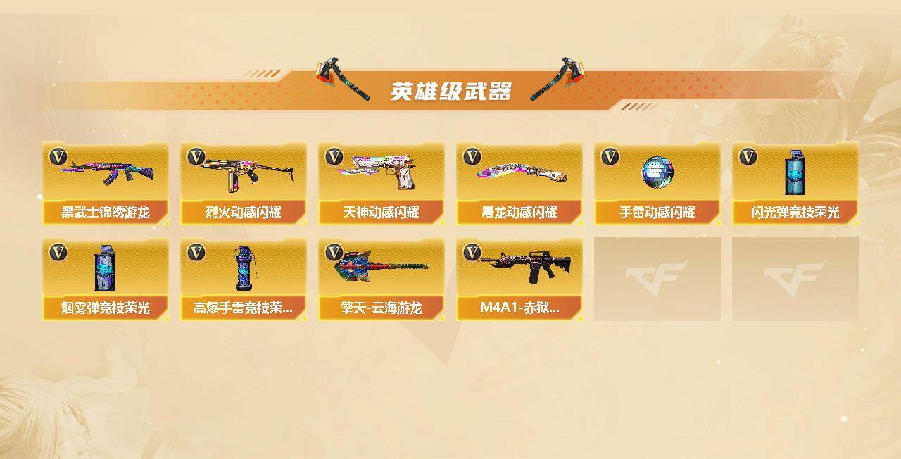 【英雄级武器】:柯尔特-竞技荣光,擎天-竞技荣光,高爆手雷-竞技荣光*3,烟雾弹-竞技荣光,闪光弹-竞技荣光,COP 357-幻灵,幻灵之锋,烈火-动感闪耀,天神-动感闪耀,屠龙-动感闪耀,手雷-动感闪耀,QBZ03-金色蔷薇,金色蔷薇-古蛇迷踪,无影-神兵利器,M4A1-雷神,M4A1-黑龙,M4A1-黑骑士,加特林-炼狱,汤姆逊-烈龙*2,AK47-火麒麟,Barrett-毁灭,Barrett-极光,AWM-裁决,AA-12-雷霆,Kar98K-星神,M200-幻神,黑武士-锦绣游龙,M4A1-赤狱骑士,修罗-古蛇迷踪,沙鹰-修罗*3,炽芒蝶刃,麒麟刺,屠龙,擎天-云海游龙