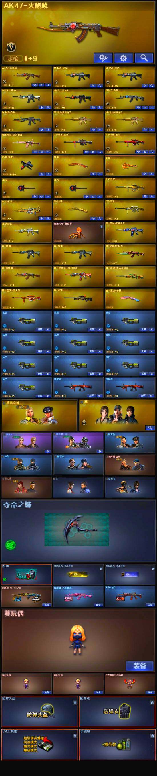 【英雄级武器】:QBZ03-金色蔷薇,M4A1-雷神,M4A1-黑龙*2,M4A1-玫瑰精灵*2,M4A1-黑骑士,AK47-无影,AK47-火麒麟*2,Barrett-毁灭,Barrett-极光,M4A1-龙血,沙鹰-修罗,擎天*2,龙啸,屠龙