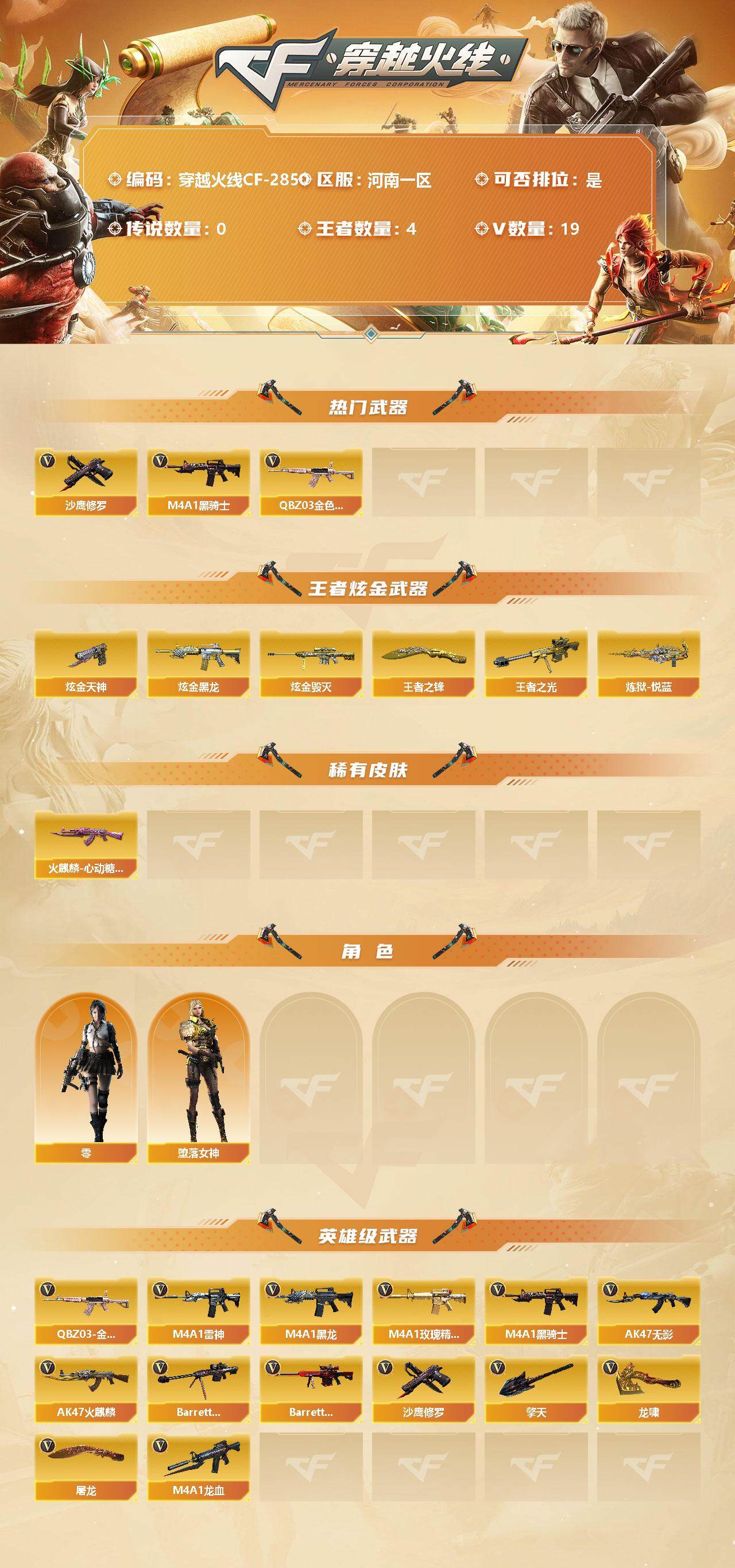 [12554963]【商品标题】:河南一区-19V-4王者-3炫金 【热门武器】:QBZ03-金色蔷薇,M4A1-黑骑士,沙鹰-修罗 【王者炫金武器】:炫金天神,炫金黑龙,炫金毁灭,炼狱-悦蓝,王者之光,王者之锋 【稀有皮肤】:火麒麟-心动糖果 【角色】:堕落女神,零 【英雄级武器】:QBZ03-金色蔷薇,M4A1-雷神,M4A1-黑龙*2,M4A1-玫瑰精灵*2,M4A1-黑骑士,AK47-无影,AK47-火麒麟*2,Barrett-毁灭,Barrett-极光,M4A1-龙血,沙鹰-修罗,擎天*2,龙啸,屠龙 【特殊枪械】:1黑骑士