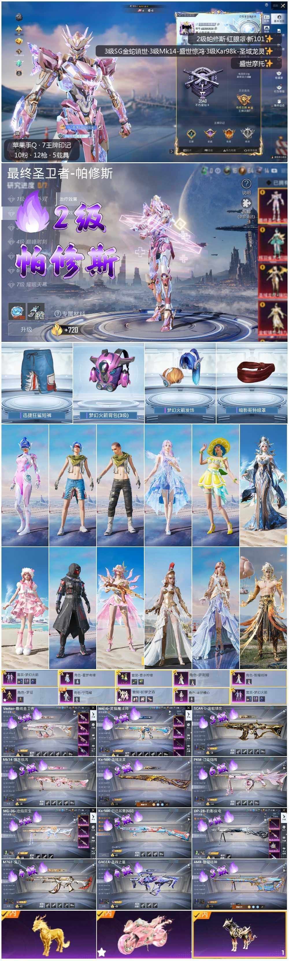 [12555519]素材身法号【特价急出/详情看图】:苹果 手Q-1神装-11粉装-12特效枪-6载具-12粉色飞行器-8w热力值-7王牌印记-131套装-246枪皮【红色神装等级】:最终圣卫者-帕修斯(二级)【热门品类】:粉装-梦幻火箭,套装-奇异狩猎者,套装-暗影哥特【粉色载具】:盛世惊鸿摩托车,踏焰逐风摩托车,僚机-冰龙团团,护世瑞兽,黑曜夜骑,冰绡玉鳞【粉色套装】:粉装-梦幻火箭,粉装-香水柠檬,角色-星梦奇缘,粉装-幻梦之森,角色-萨利娅,角色-智耀战神,角色-宁雨蝶,角色-天穹,角色-罗征,角色-灵玺,角色-羊梦糖心【粉色枪皮等级】:SCAR-L-金蛇镇世(三级),M416-灵猫魔法师(三级),GROZA-圣辉之星(四级),M762-鬼刀(四级),Vector-最终圣卫者(三级),Kar98K-巳巳如意(五级),Kar98K-圣域龙灵(三级),Mk14-盛世惊鸿(三级),AMR-智耀战神(三级),DP-28-豹影疾电(五级),PKM-江南烟雨(六级),MG-36-沧焰双生(五级)【粉色飞行器】:梦幻火箭飞行器,镜域双华-灵镜之阶,动力核心飞行器,凤舞九天飞行器,万象金身飞行器,圣域金龙飞行器,绯果甜心飞行器,终晖之翼飞行器,灵猫魔法师飞行器,飞天猪飞行器,灵珠游龙飞行器