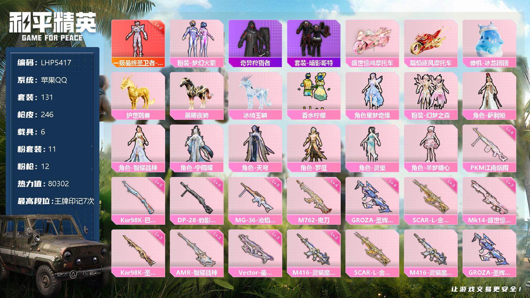 - [12947489]雪国幻梦!新101 金玛莎!安卓 手Q-5粉装-5特效枪-3载具-2粉色飞行器-60349热力值-16王牌印记-148套装-159枪皮 【热门品类】:粉装-雪国幻梦,粉装-梦幻火箭,套装-龟仙人,套装-浪漫波比,熔岩游骑兵面罩,熔岩游骑兵连帽夹克 【粉色载具】:玛莎拉蒂Ghibli(金),玛莎拉蒂Ghibli(蓝),双人摩托-梦幻火箭 【粉色套装】:粉装-守护骑士,粉装-幻影战神,粉装-金曜白虎,粉装-雪国幻梦,粉装-梦幻火箭 【粉色枪皮等级】:SCAR-L-梦幻火箭(七级),M416-五爪金龙(七级),UMP45-雪国精灵(七级),Kar98K-巳巳如意(五级),DP-28-豹影疾电(五级) 【粉色枪皮】:SCAR-L-梦幻火箭,M416-五爪金龙,UMP45-雪国精灵,Kar98K-巳巳如意,DP-28-豹影疾电 【粉色飞行器】:春暖花开飞行器,梦幻火箭飞行器 【粉色降落伞】:至尊龙雀降落伞,雪国幻梦降落伞,春暖花开降落伞,梦幻火箭降落伞,蓝莓炮弹降落伞,碧影闪光降落伞,恐龙拽拽降落伞,猪猪侠降落伞 【稀有套装】:套装-龟仙人,角色-瑰梦爱神 【稀有枪皮】:AKM-夜灯,AKM-彩虹符号,AKM-春暖花开,AKM-灼热熔岩,AKM-生命誓言,AKM-破晓战魂,AKM-虎虎生威,AKM-霓虹街区,M16A4-幻世战舞者,M16A4-魔法学院,SCAR-L-炫彩节奏,SCAR-L-玉兔迎春,M416-夜灯,M416-红色方程式,M416-魔法学院,GROZA-异彩先驱,GROZA-春暖花开,GROZA-紫翼圣骑,GROZA-蓝莓炮弹,GROZA-银河战甲,GROZA-黑色刀锋,AUG-怪笑疯兔,AUG-耀粉歌者,QBZ-原初圣火,QBZ-银河战甲,QBZ-飞驰魅影,M762-彩虹符号,M762-拳皇97,M762-牛气冲天,M762-瑞龙福将,M762-绯红前夜,G36C-雪国精灵,AC-VAL-天降萌叽,AC-VAL-闲梦青缨,蜜獾-天降萌叽,UZI-天降萌叽,UZI-炫彩节奏,UMP45-春暖花开,UMP45-涂山之恋,UMP45-生命誓言,Vector-彩虹符号,Vector-黑色刀锋,汤姆逊-天降萌叽,汤姆逊-异彩先驱,汤姆逊-炫彩节奏,汤姆逊-耀粉歌者,MP5K-异彩先驱,P90-飞驰魅影,Kar98K-彩虹符号,Kar98K-梦幻火箭,Kar98K-飞