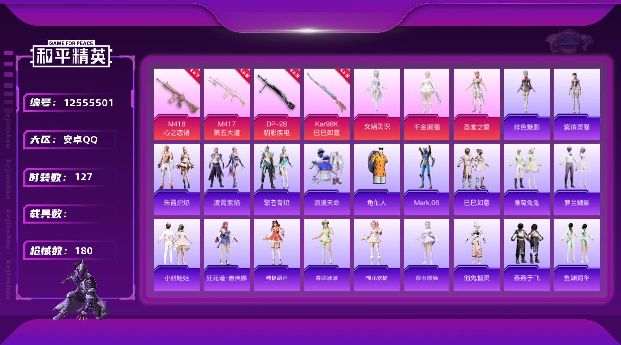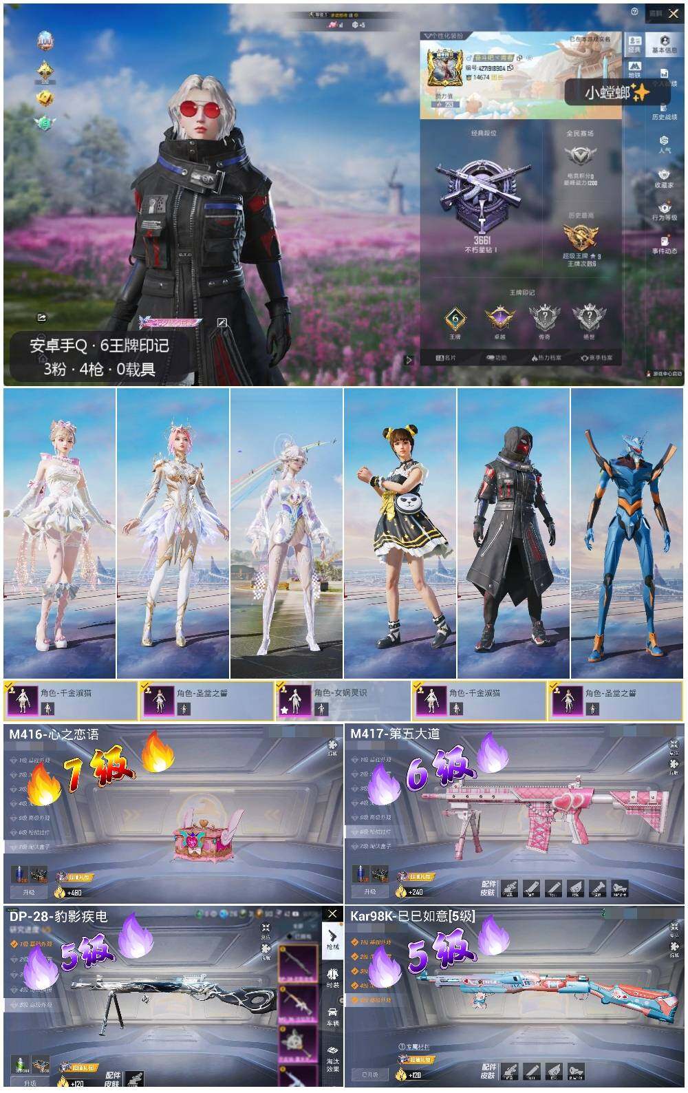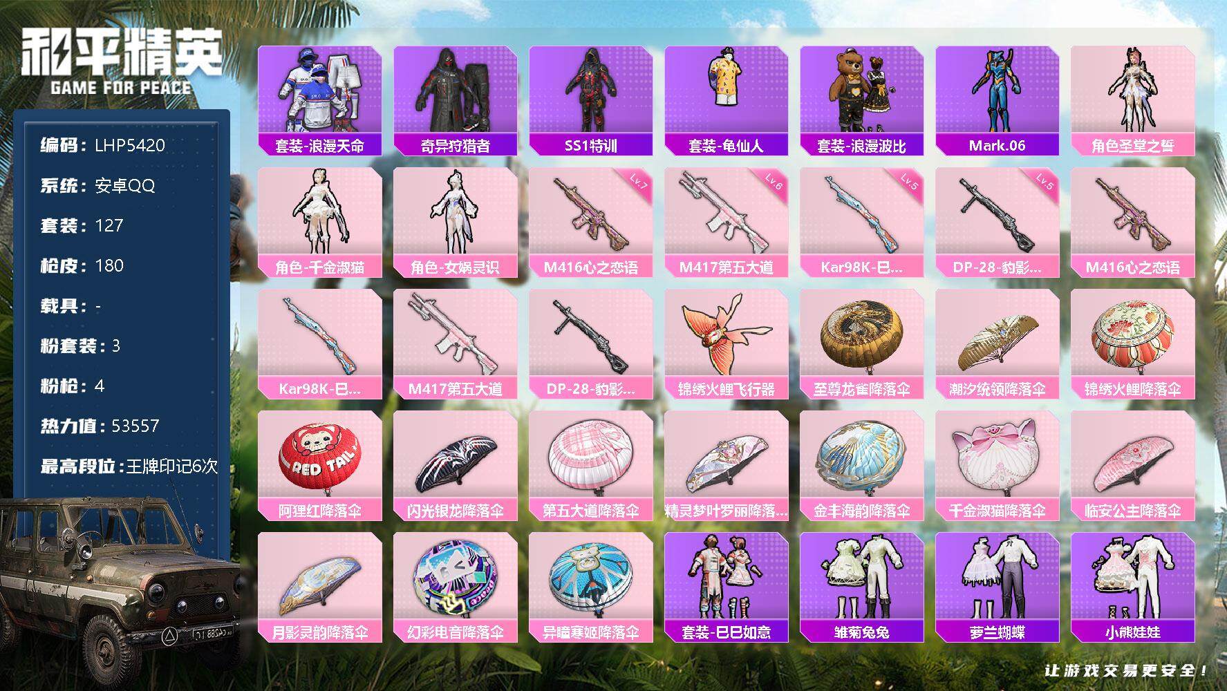 [12555501]【特价急出/详情看图】:安卓 手Q-3粉装-4特效枪-1粉色飞行器-5.3w热力值-6王牌印记-127套装-180枪皮【热门品类】:套装-浪漫天命,套装-奇异狩猎者,套装-SS1特训,套装-龟仙人,套装-浪漫波比,角色-Mark.06【粉色套装】:角色-圣堂之誓,角色-千金淑猫,角色-女娲灵识【粉色枪皮等级】:M416-心之恋语(七级),Kar98K-巳巳如意(五级),M417-第五大道(六级),DP-28-豹影疾电(五级)【粉色飞行器】:锦绣火鲤飞行器