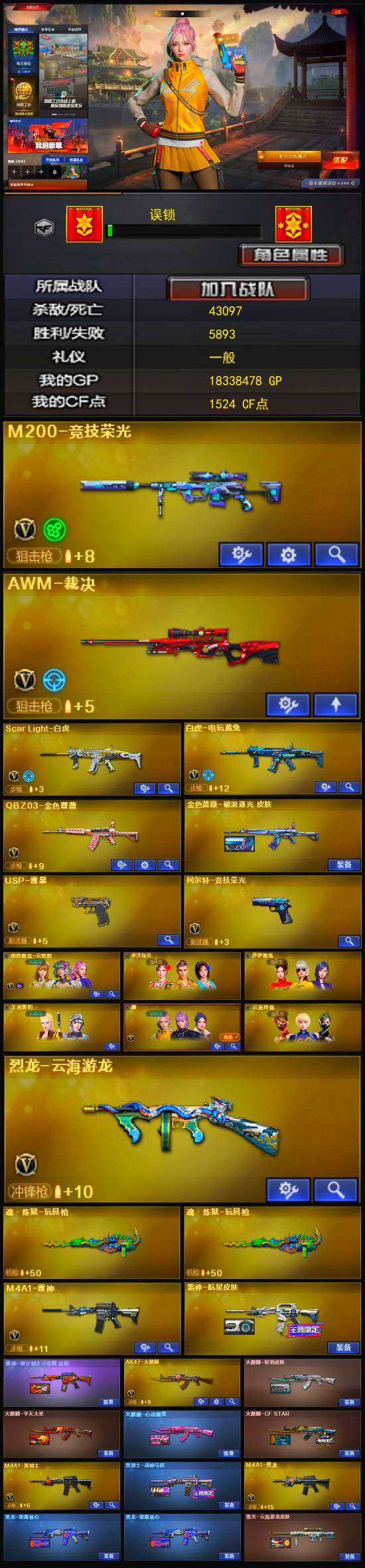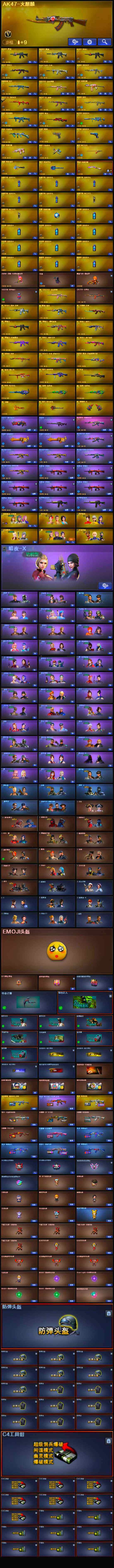 【英雄级武器】:唐刀-神工天巧,M200-竞技荣光,柯尔特-竞技荣光,擎天-竞技荣光,高爆手雷-竞技荣光*5,烟雾弹-竞技荣光*4,闪光弹-竞技荣光*6,USP-雷暴,烈火-动感闪耀,天神-动感闪耀,屠龙-动感闪耀,手雷-动感闪耀,QBZ03-金色蔷薇,Scar Light-白虎,白虎-电玩蓝兔,M4A1-雷神,M4A1-黑龙,M4A1-黑骑士,AK47-火麒麟,AK47-黑武士,AWM-裁决,超新星-热带奇洋,AK-47-猩红传说,AK47-B-战神,AK47-B-常胜将军,修罗-云海游龙,龙啸-热带奇洋