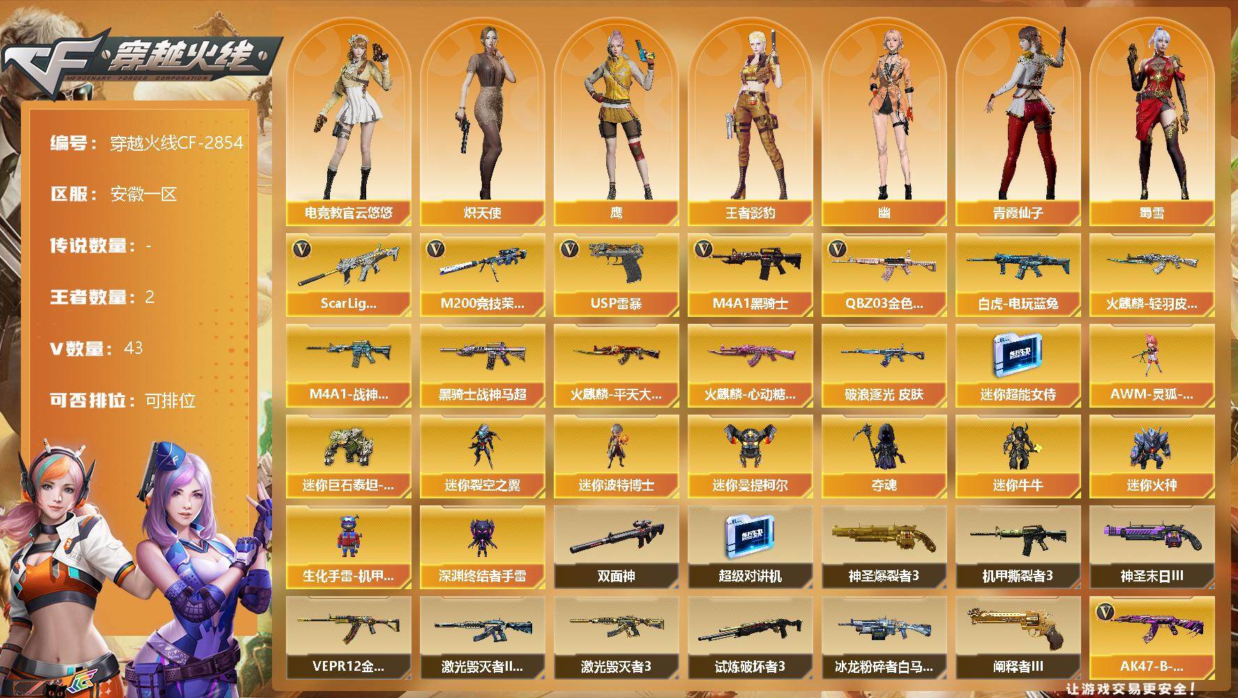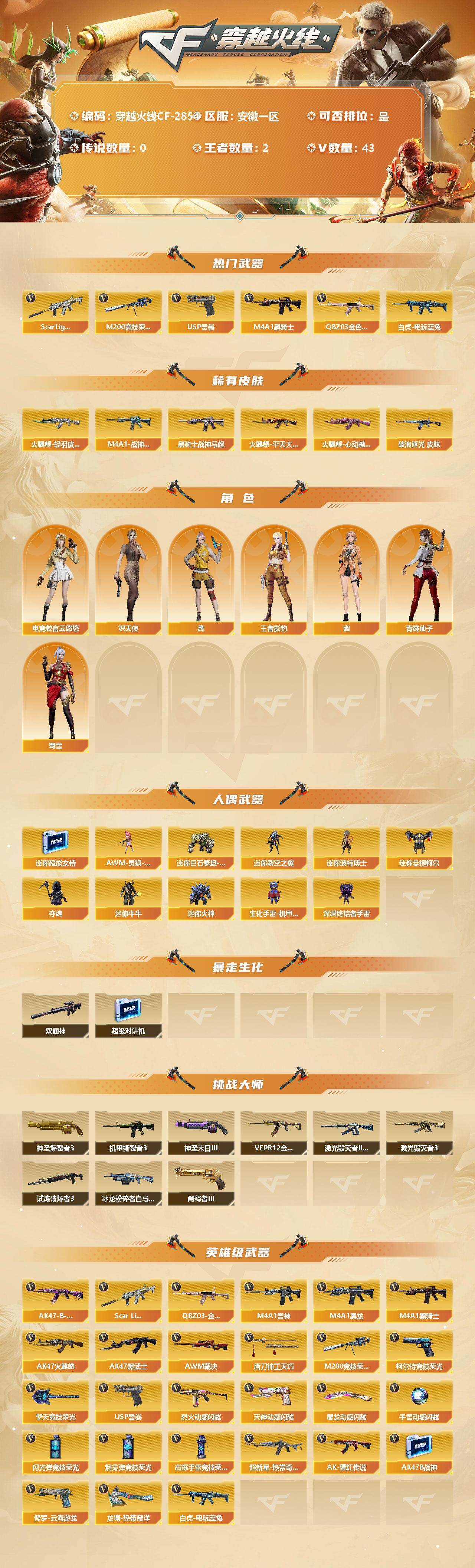 [12555930]【商品标题】:安徽一区-43V-2王者-0炫金 【热门武器】:QBZ03-金色蔷薇,Scar Light-白虎,M200-竞技荣光,白虎-电玩蓝兔,M4A1-黑骑士,USP-雷暴 【稀有皮肤】:金色蔷薇-破浪逐光 皮肤,M4A1-战神赵云,火麒麟-轻羽皮肤,火麒麟-平天大圣,火麒麟-心动糖果,黑骑士-战神马超 【角色】:王者影豹,幽,电竞教官-云悠悠,鹰,蜀雪,炽天使,青霞仙子 【人偶武器】:AWM-灵狐-15周年嘉年华,迷你超能女侍,迷你巨石泰坦-魔花研究所,迷你裂空之翼,迷你波特博士,迷你曼提柯尔,夺魂,迷你牛牛,迷你火种,生化手雷-机甲核心,深渊终结者手雷 【暴走生化】:双面神,超级对讲机 【挑战大师】:神圣爆裂者III,机甲撕裂者III*2,神圣爆裂者-末日III*2,阐释者III,试炼破坏者III*3,激光毁灭者III*2,VEPR-12-金魔,激光毁灭者III-白马银枪,冰龙粉碎者-白马银枪 【英雄级武器】:唐刀-神工天巧,M200-竞技荣光,柯尔特-竞技荣光,擎天-竞技荣光,高爆手雷-竞技荣光*5,烟雾弹-竞技荣光*4,闪光弹-竞技荣光*6,USP-雷暴,烈火-动感闪耀,天神-动感闪耀,屠龙-动感闪耀,手雷-动感闪耀,QBZ03-金色蔷薇,Scar Light-白虎,白虎-电玩蓝兔,M4A1-雷神,M4A1-黑龙,M4A1-黑骑士,AK47-火麒麟,AK47-黑武士,AWM-裁决,超新星-热带奇洋,AK-47-猩红传说,AK47-B-战神,AK47-B-常胜将军,修罗-云海游龙,龙啸-热带奇洋 【特殊枪械】:1白虎,1黑骑士