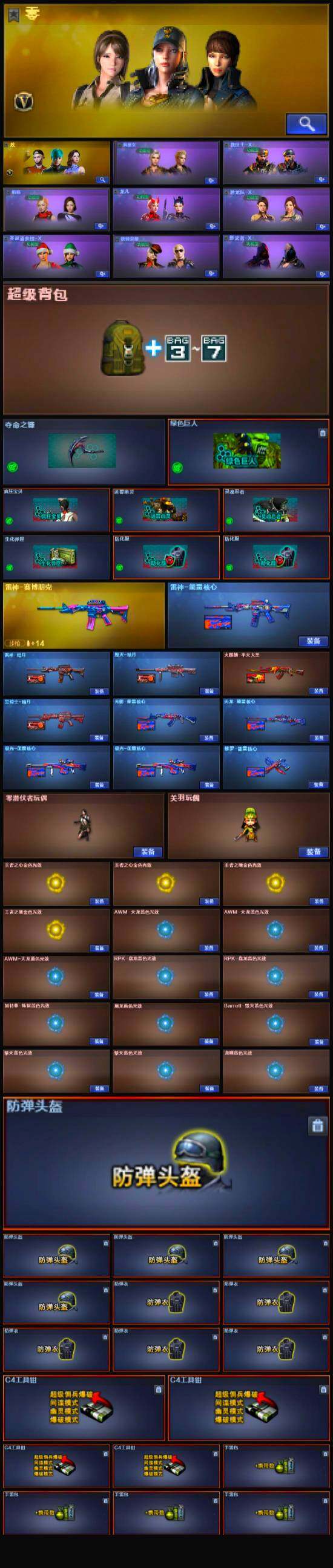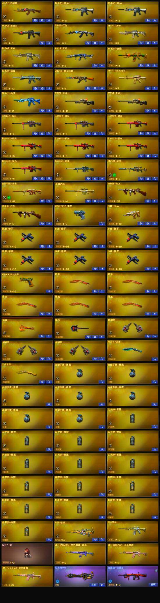 【英雄级武器】:M4A1-雷霆,M4A1-武圣,Glock18-武圣,M4A1-雷神*2,M4A1-玫瑰精灵,M4A1-黑骑士,M4A1-死神*2,汤姆逊-烈龙*2,AK47-无影,AK47-火麒麟,AK12-天启,AWM-天龙*2,Barrett-毁灭*2,Barrett-极光*5,AK47-机械迷城,Barrett-朱雀,M200-幻神,黑骑士-海王,沙鹰-天神,沙鹰-修罗*6,麒麟刺*3,擎天,龙啸,屠龙*5