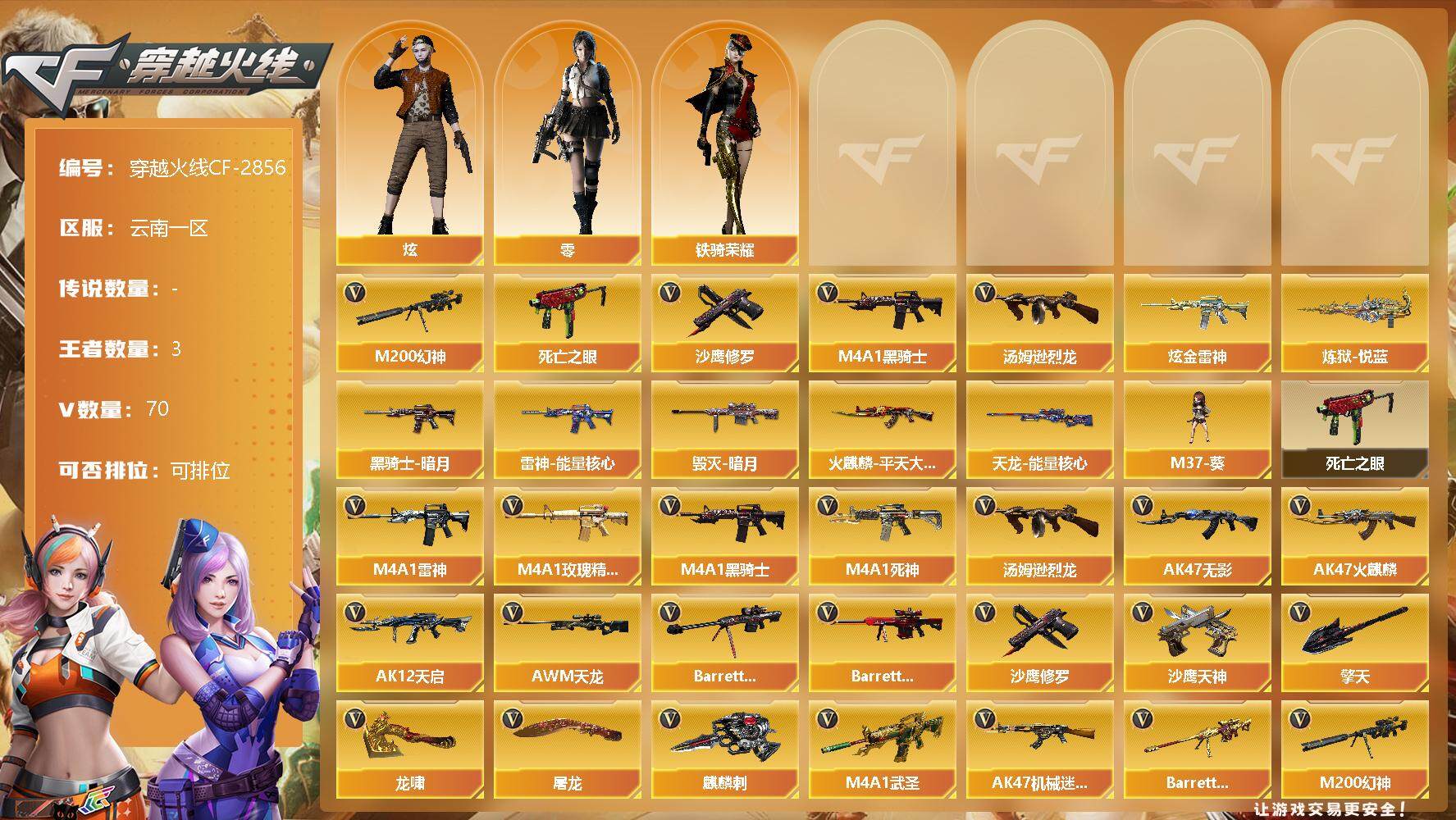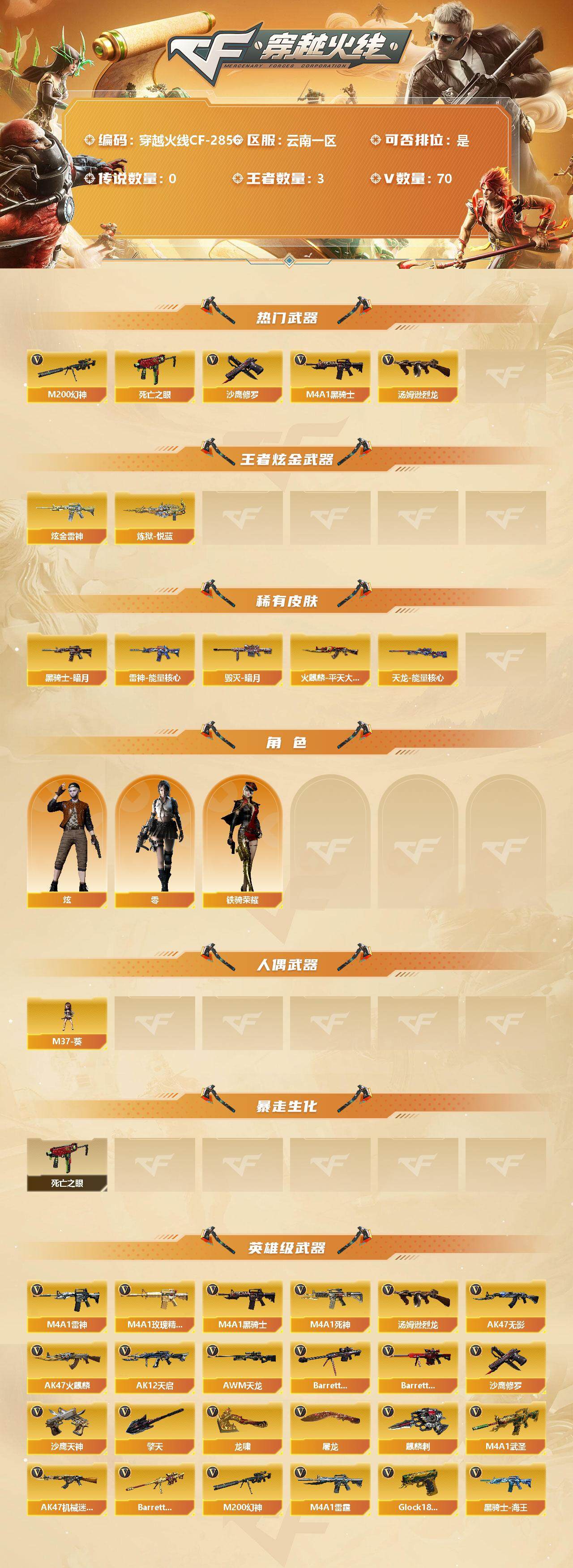 [12556638]【商品标题】:云南一区-70V-3王者-1炫金 【热门武器】:M200-幻神,死亡之眼*2,M4A1-黑骑士,汤姆逊-烈龙*2,沙鹰-修罗*6 【王者炫金武器】:炫金雷神,炼狱-悦蓝 【稀有皮肤】:雷神-能量核心,火麒麟-平天大圣,黑骑士-暗月,毁灭-暗月,天龙-能量核心 【角色】:零,炫,铁骑荣耀 【人偶武器】:M37-葵 【暴走生化】:死亡之眼*2 【英雄级武器】:M4A1-雷霆,M4A1-武圣,Glock18-武圣,M4A1-雷神*2,M4A1-玫瑰精灵,M4A1-黑骑士,M4A1-死神*2,汤姆逊-烈龙*2,AK47-无影,AK47-火麒麟,AK12-天启,AWM-天龙*2,Barrett-毁灭*2,Barrett-极光*5,AK47-机械迷城,Barrett-朱雀,M200-幻神,黑骑士-海王,沙鹰-天神,沙鹰-修罗*6,麒麟刺*3,擎天,龙啸,屠龙*5 【特殊枪械】:1黑骑士,2烈龙