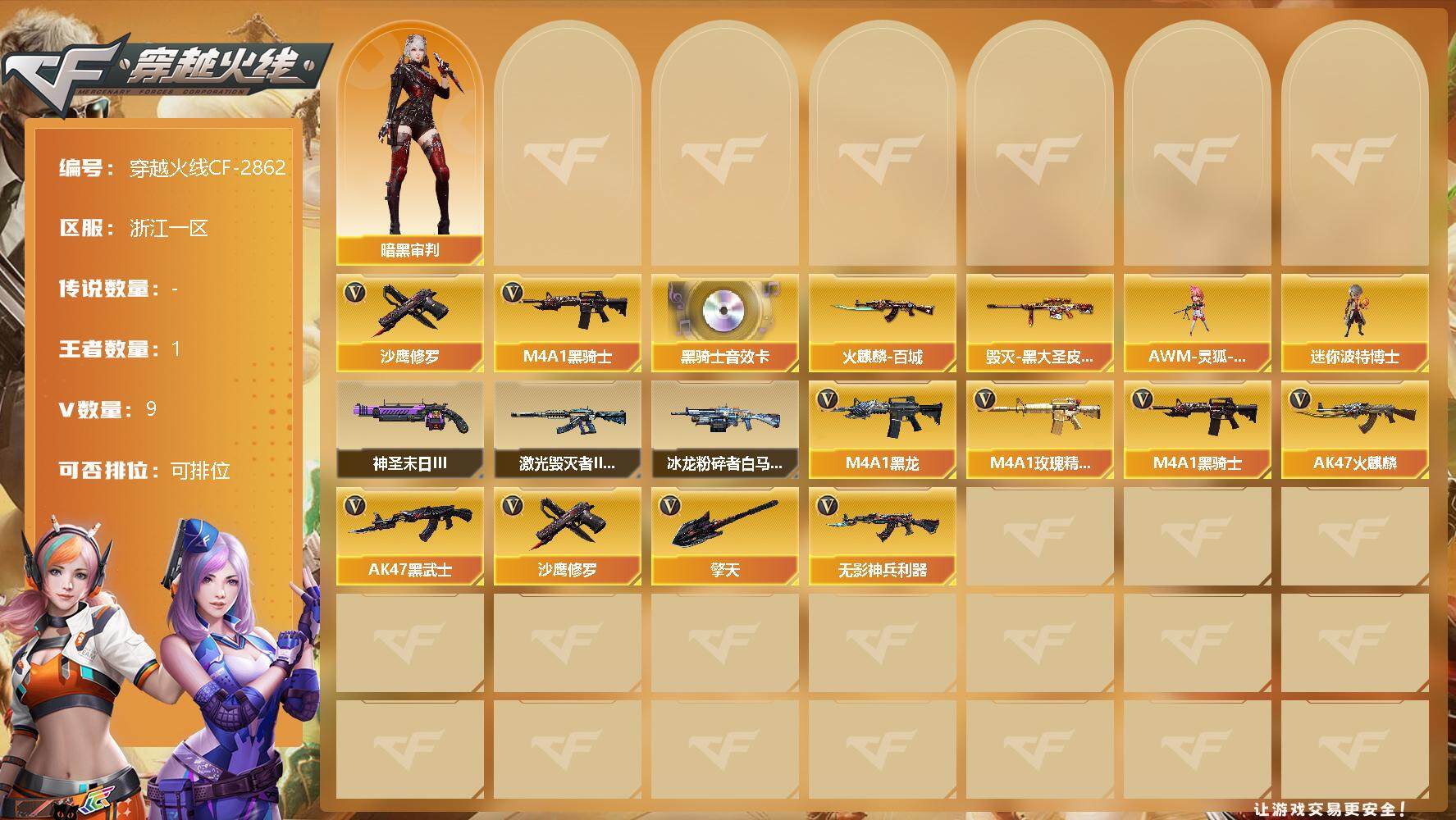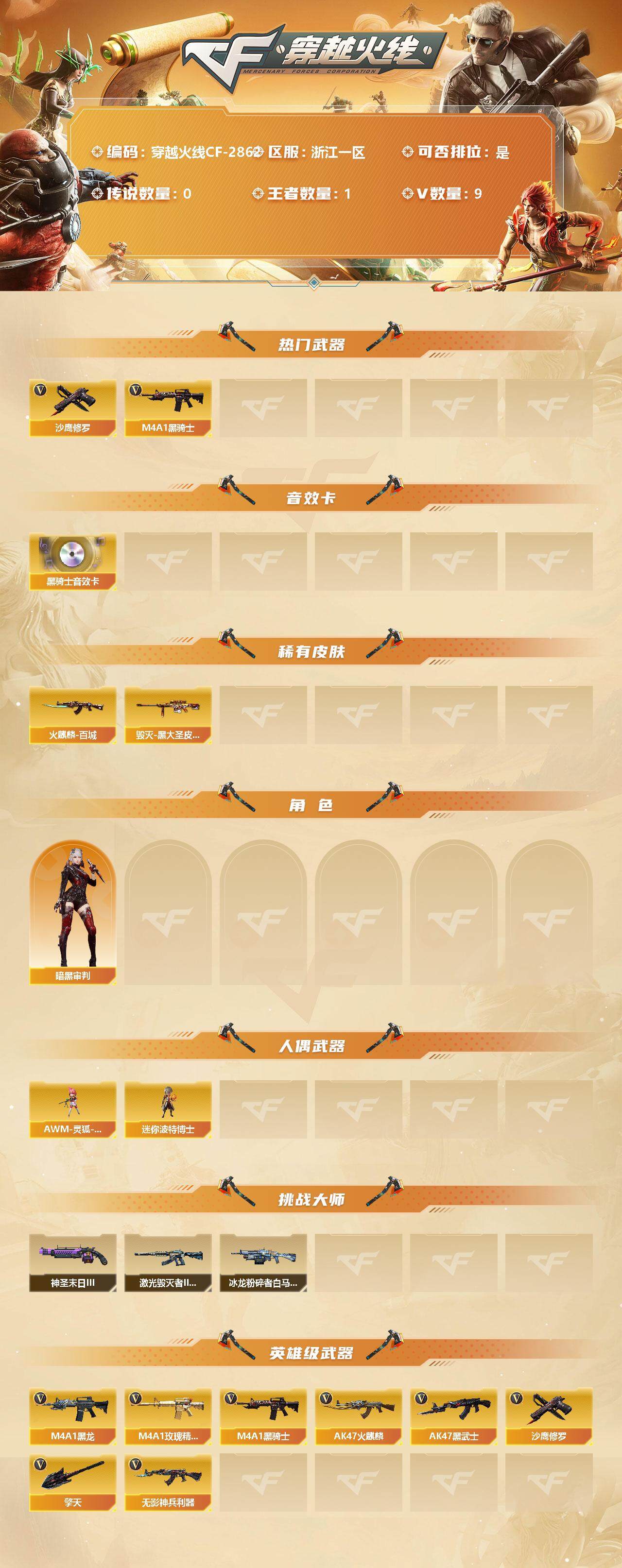 [12558878]【商品标题】:浙江一区-9V-1王者-0炫金 【热门武器】:M4A1-黑骑士,沙鹰-修罗 【音效卡】:M4A1-黑骑士音效卡 【稀有皮肤】:火麒麟-百城,毁灭-黑大圣皮肤*2 【角色】:暗黑审判 【人偶武器】:AWM-灵狐-15周年嘉年华,迷你波特博士 【挑战大师】:神圣爆裂者-末日III,激光毁灭者III-白马银枪,冰龙粉碎者-白马银枪 【英雄级武器】:无影-神兵利器,M4A1-黑龙,M4A1-玫瑰精灵,M4A1-黑骑士,AK47-火麒麟,AK47-黑武士,沙鹰-修罗,擎天 【特殊枪械】:1黑骑士