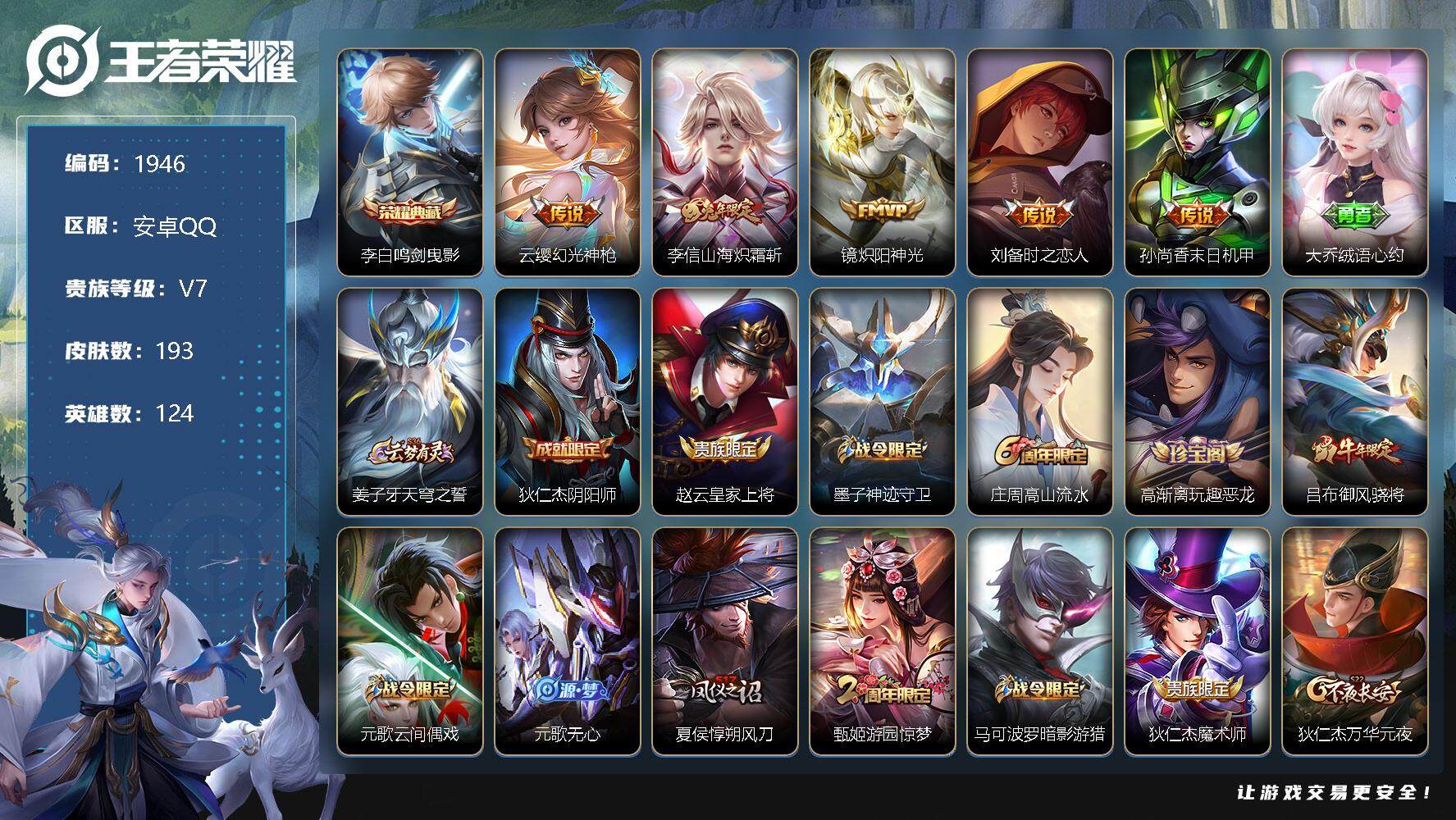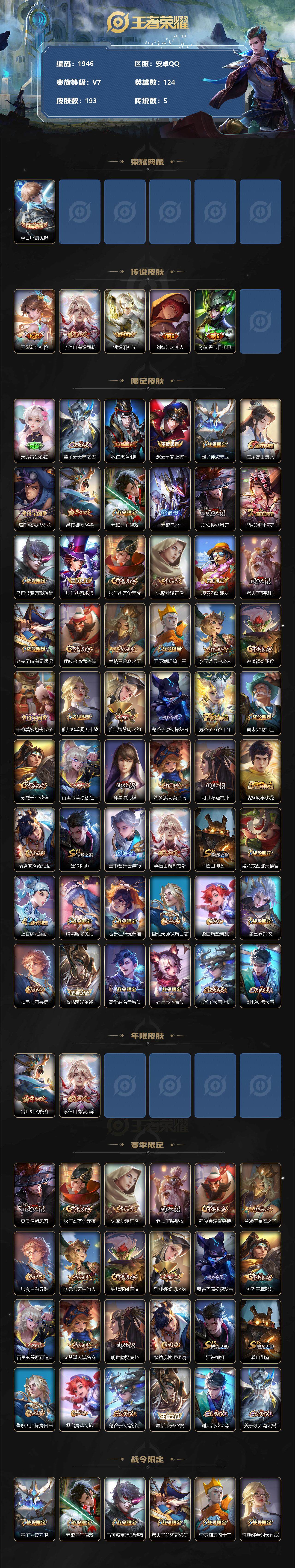 [12559040]【商品标题】:安卓Q-V4-永恒钻石I段位-124英雄-193皮肤-1典藏-0珍品无双-0无双-0珍品传说-5传说-53史诗