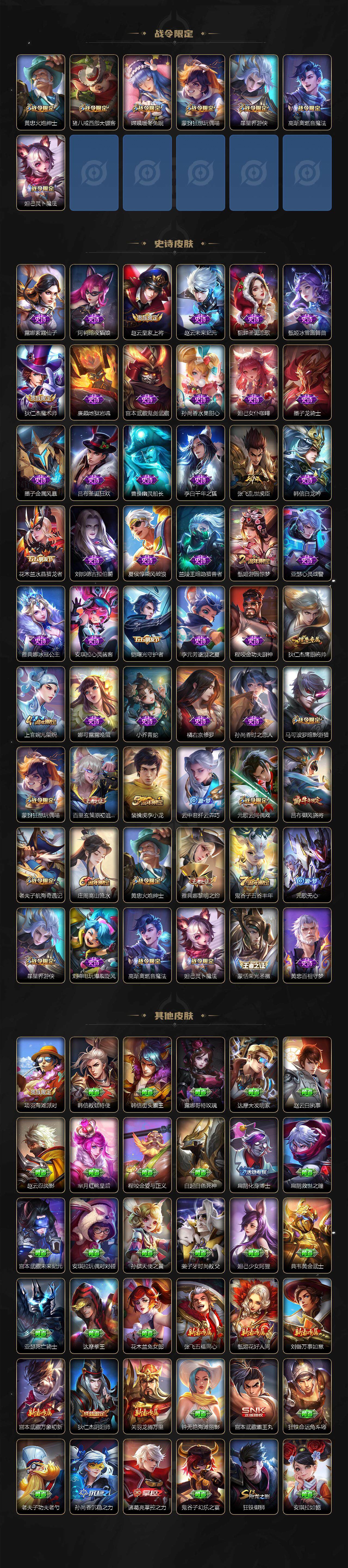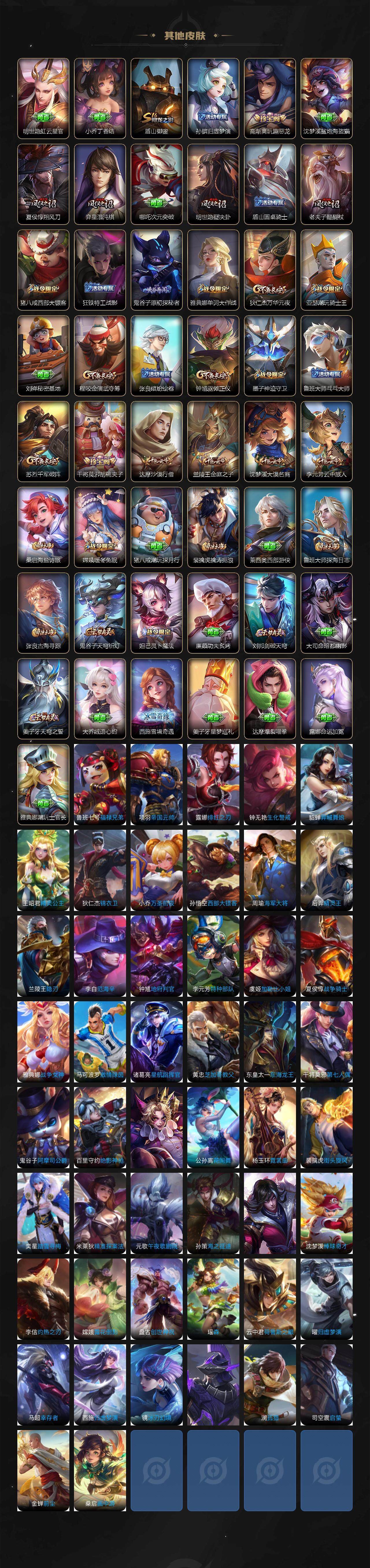 【限定皮肤】:大乔绒语心约,姜子牙天穹之誓,狄仁杰阴阳师,赵云皇家上将,墨子神迹守卫,庄周高山流水,高渐离玩趣恶龙,吕布御风骁将,元歌云间偶戏,元歌无心,夏侯惇朔风刀,甄姬游园惊梦,马可波罗暗影游猎,狄仁杰魔术师,狄仁杰万华元夜,达摩沙漠行僧,项羽海滩派对,老夫子醍醐杖,老夫子航海奇遇记,程咬金演武夺筹,兰陵王金庭之子,亚瑟潮玩骑士王,李元芳云中旅人,钟馗驱傩正仪,干将莫邪胡桃夹子,雅典娜单词大作战,雅典娜黎明之约,鬼谷子原初探秘者,鬼谷子五谷丰年,黄忠火炮绅士,苏烈千军破阵,百里玄策原初追逐者,弈星混沌棋,沈梦溪大漠名商,明世隐疑决卦,裴擒虎李小龙,裴擒虎擒涛扼浪,狂铁御狮,云中君纤云弄巧,李信山海炽霜斩,盾山御銮,猪八戒西部大镖客,上官婉儿梁祝,嫦娥暖冬兔眠,蒙犽狂想玩偶喵,鲁班大师探海日志,桑启海盐诗旅,暃星界游侠,张良古海寻踪,蒙恬荣光圣徽,高渐离燃音魔法,妲己灵卜魔法,鬼谷子天穹祈灯,刘邦剑破天穹