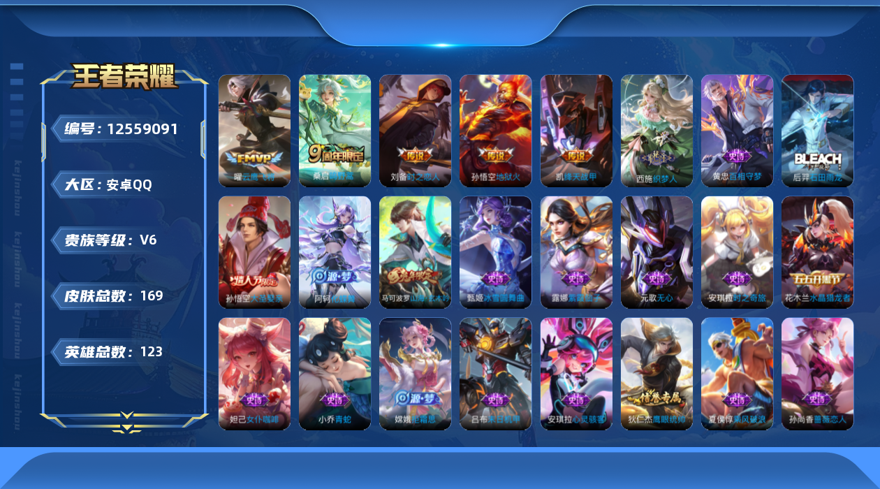[12559091]【商品标题】:安卓Q-V4-至尊星耀I段位-124英雄-169皮肤-0典藏-0珍品无双-0无双-0珍品传说-5传说-32史诗