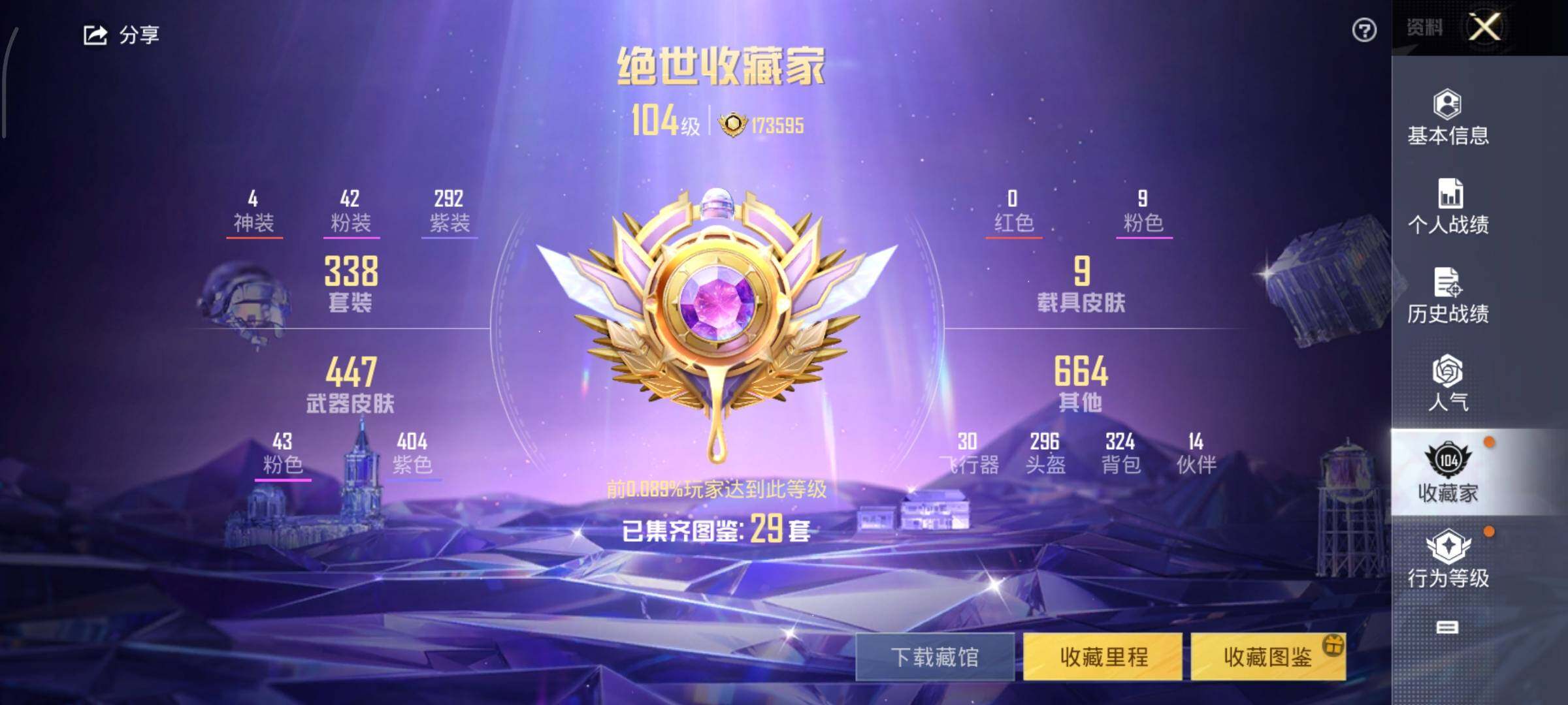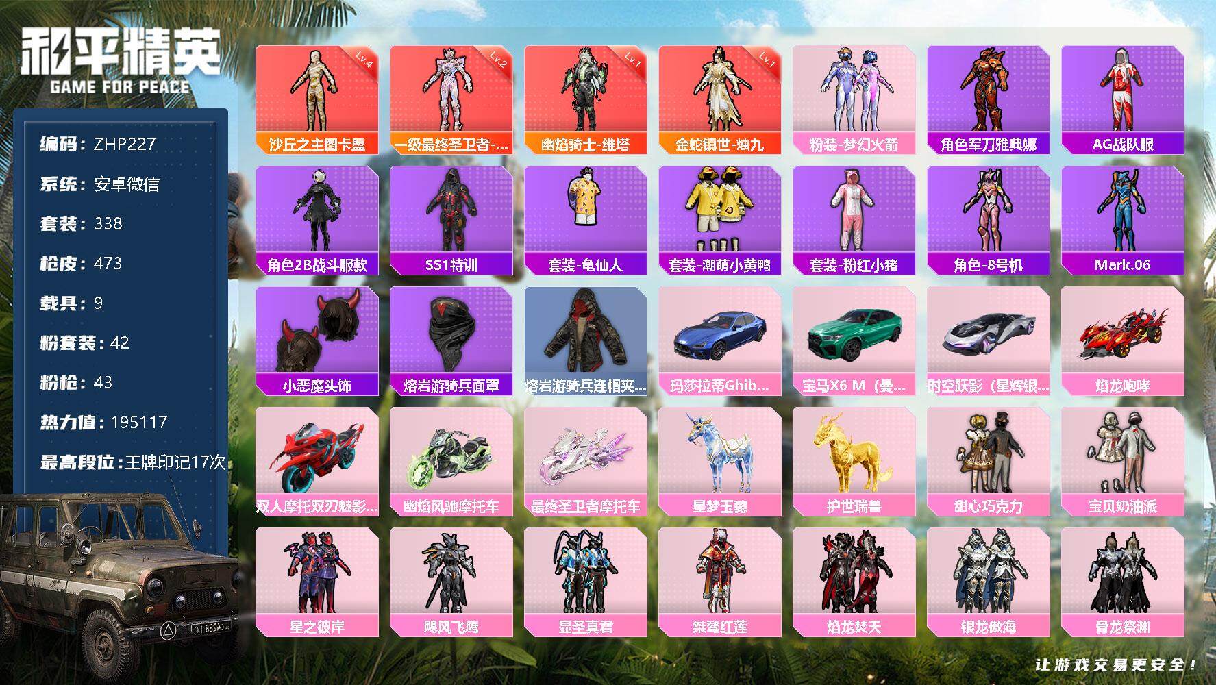 [12559118]双字ID讫宁-2绝世-8级M4至情至圣-安卓-4神装-42粉装-43特效枪-9载具-20粉色飞行器-195117热力值-17王牌印记-338套装-473枪皮