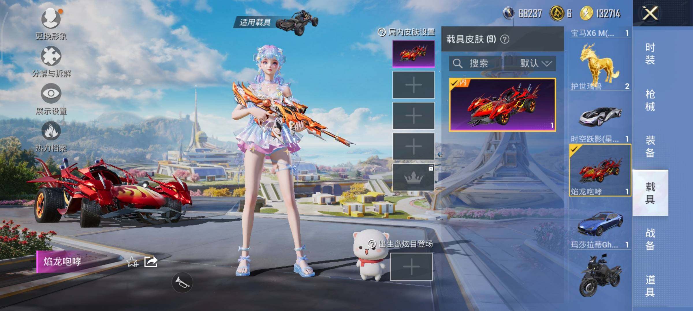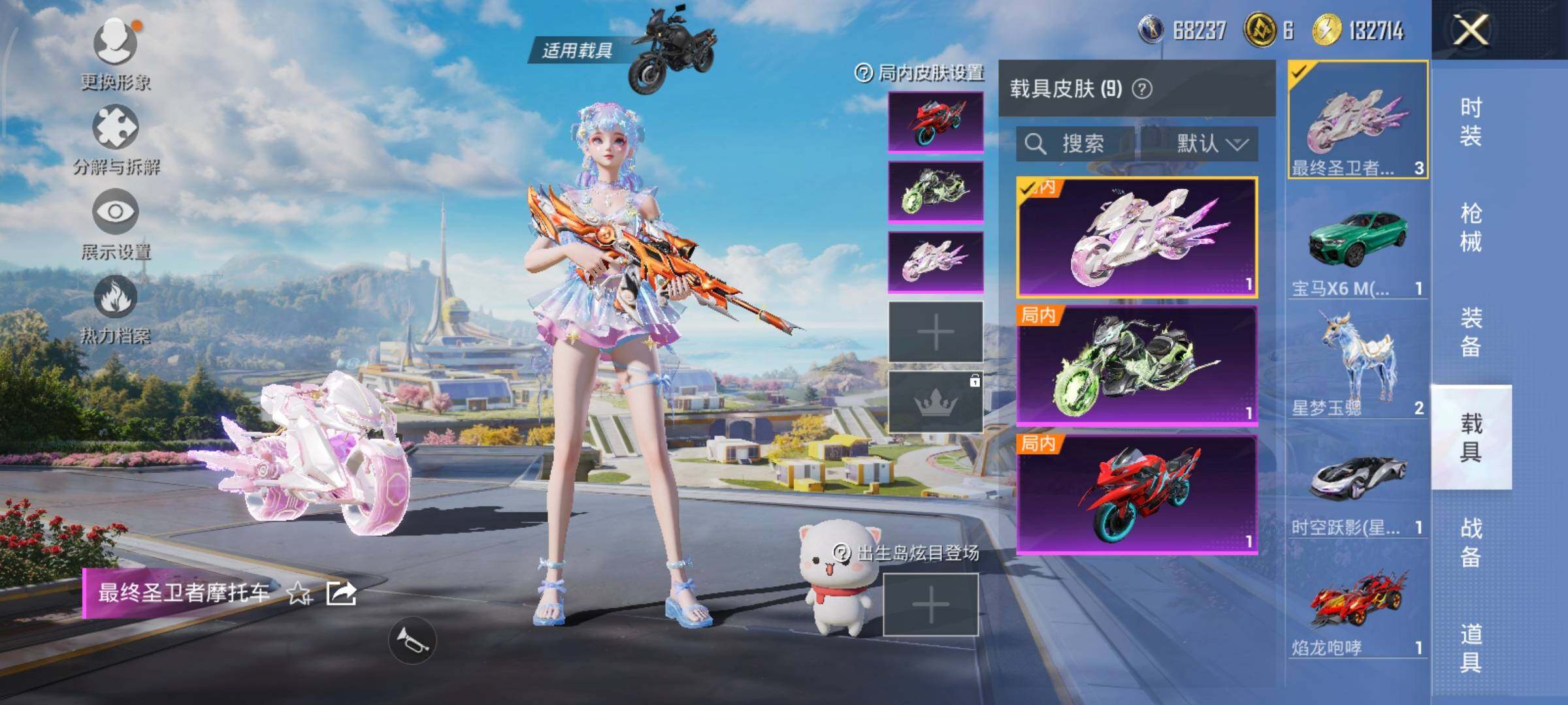 【粉色载具】:玛莎拉蒂Ghibli(蓝),宝马X6 M(曼岛绿),时空跃影(星辉银),焰龙咆哮,双人摩托-双刃魅影(红),幽焰风驰摩托车,最终圣卫者摩托车,星梦玉骢,护世瑞兽