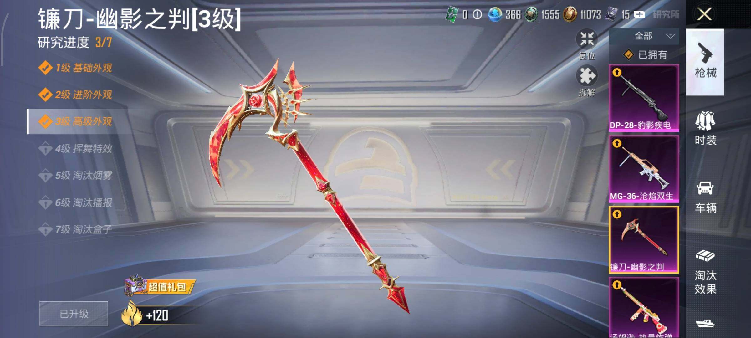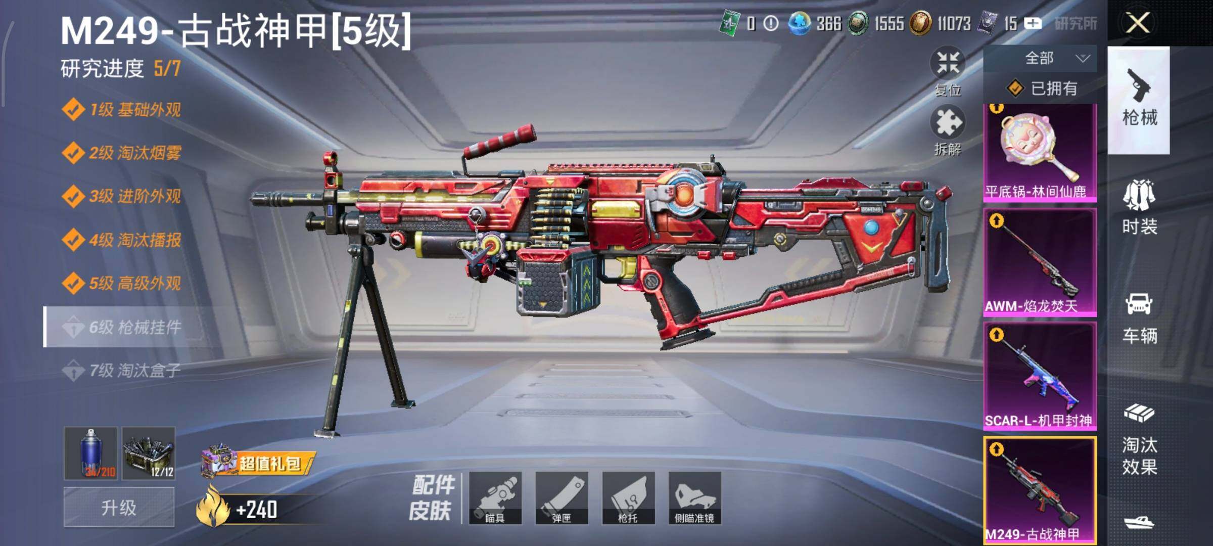 AKM-梦之光华,AKM-幽焰骑士,M16A4-垂柳戏鸭,SCAR-L-机甲封神,SCAR-L-金蛇镇世,M416-五爪金龙,M416-至情至圣,M416-墨龙九天,GROZA-焦糖拿铁,AUG-超新星,Famas-觉醒初号机,UMP45-量子极限,UMP45-宇宙意志,Vector-红伞翩翩,Vector-环太平洋,AKS-74U-信仰神谕,P90-甜蜜草莓,P90-沙丘之主,Kar98K-圣光天使,Kar98K-巳巳如意,M24-暗星紫秘,AWM-焰龙焚天,Mk14-精灵梦叶罗丽,Mk14-盛世惊鸿,AMR-炫光之旅,M417-第五大道,M200-玉鳞金羽,MK12-雪月幻音,M249-古战神甲,M249-蓝莓炮弹,DP-28-暗夜鎏金,MG3-炙焰牛王,爆炸猎弓-雪梅暗香,平底锅-林间仙鹿,破片手榴弹-粉粉猫爪
