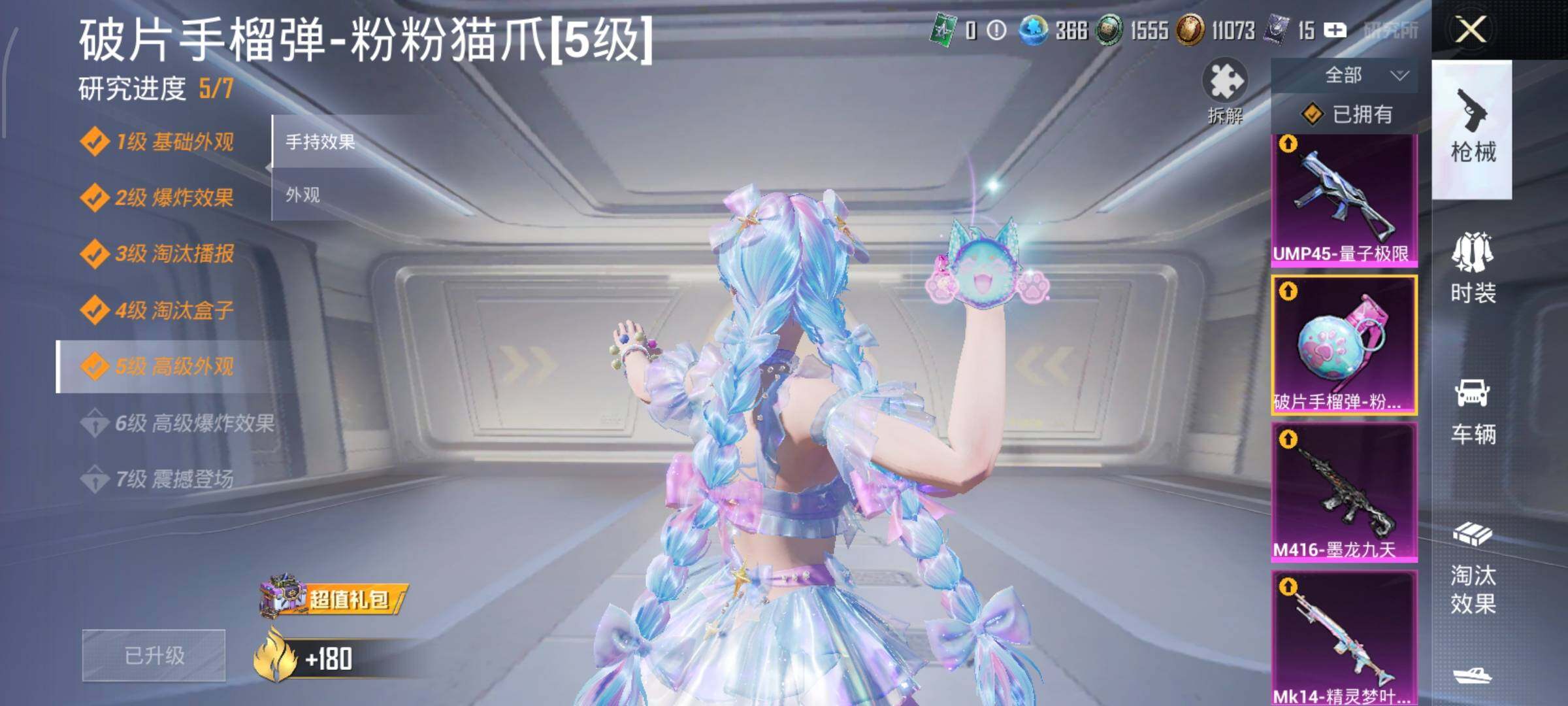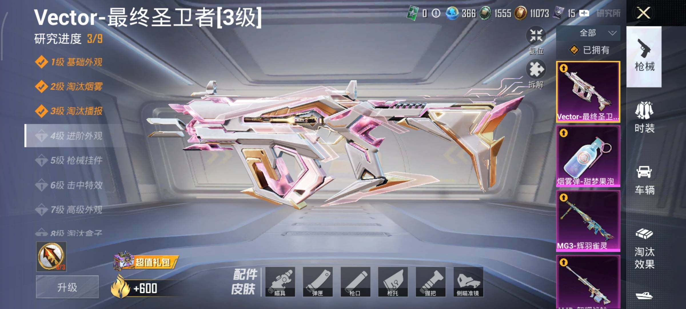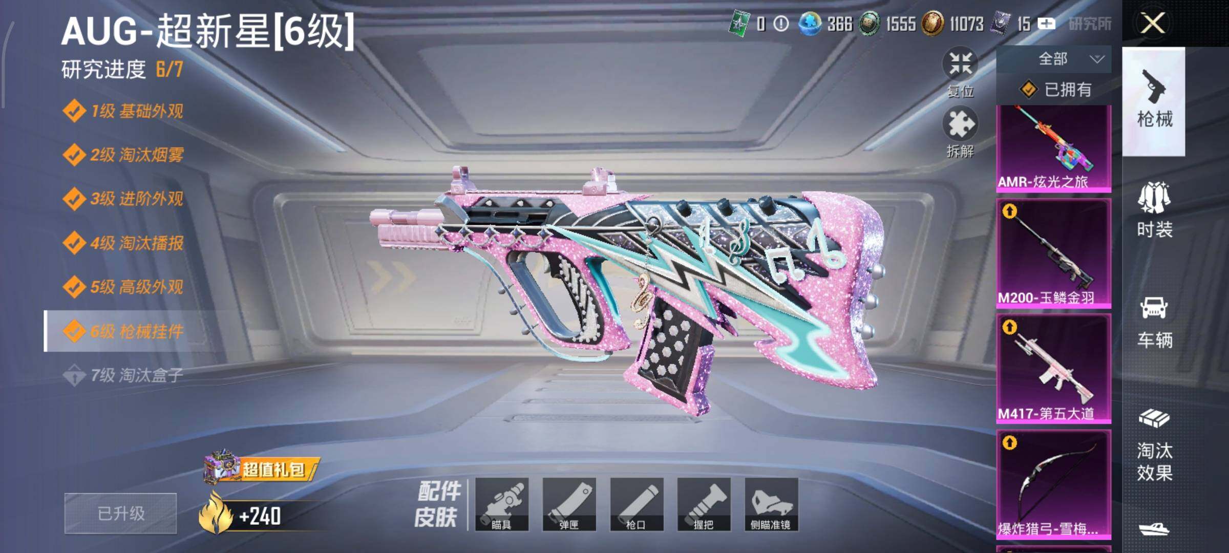 【粉色枪皮等级】:AKM-梦之光华(四级),AKM-幽焰骑士(三级),M16A4-垂柳戏鸭(四级),SCAR-L-机甲封神(三级),SCAR-L-金蛇镇世(三级),M416-五爪金龙(三级),M416-至情至圣(八级),M416-墨龙九天(三级),GROZA-焦糖拿铁(四级),AUG-超新星(六级),Famas-初号机 觉醒Ver.(三级),UMP45-量子极限(五级),UMP45-宇宙意志(三级),Vector-红伞翩翩(一级),Vector-环太平洋(四级),Vector-最终圣卫者(三级),汤姆逊-星