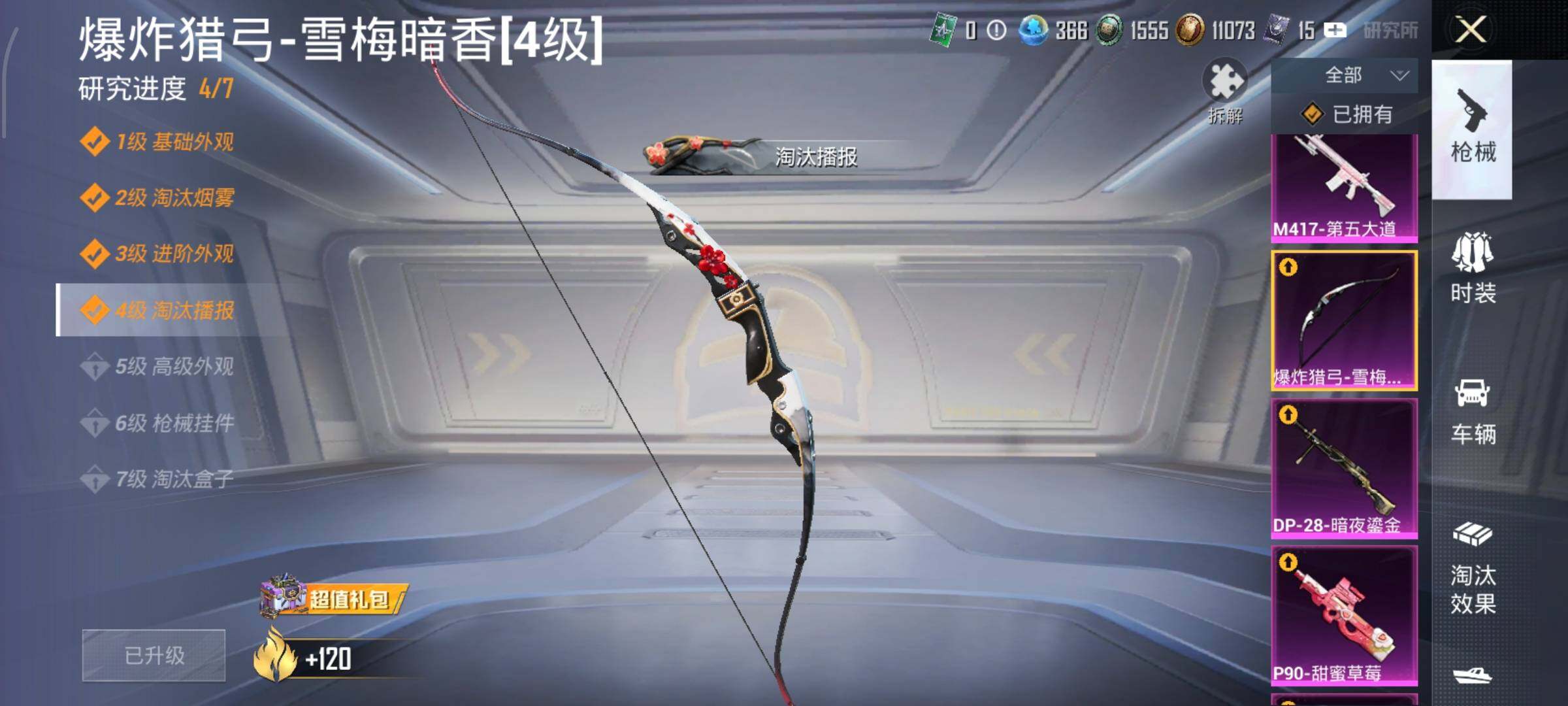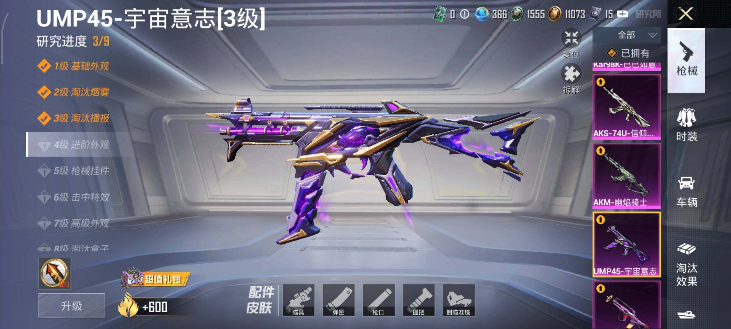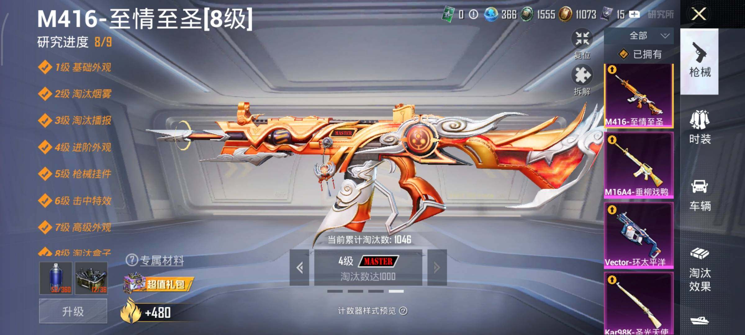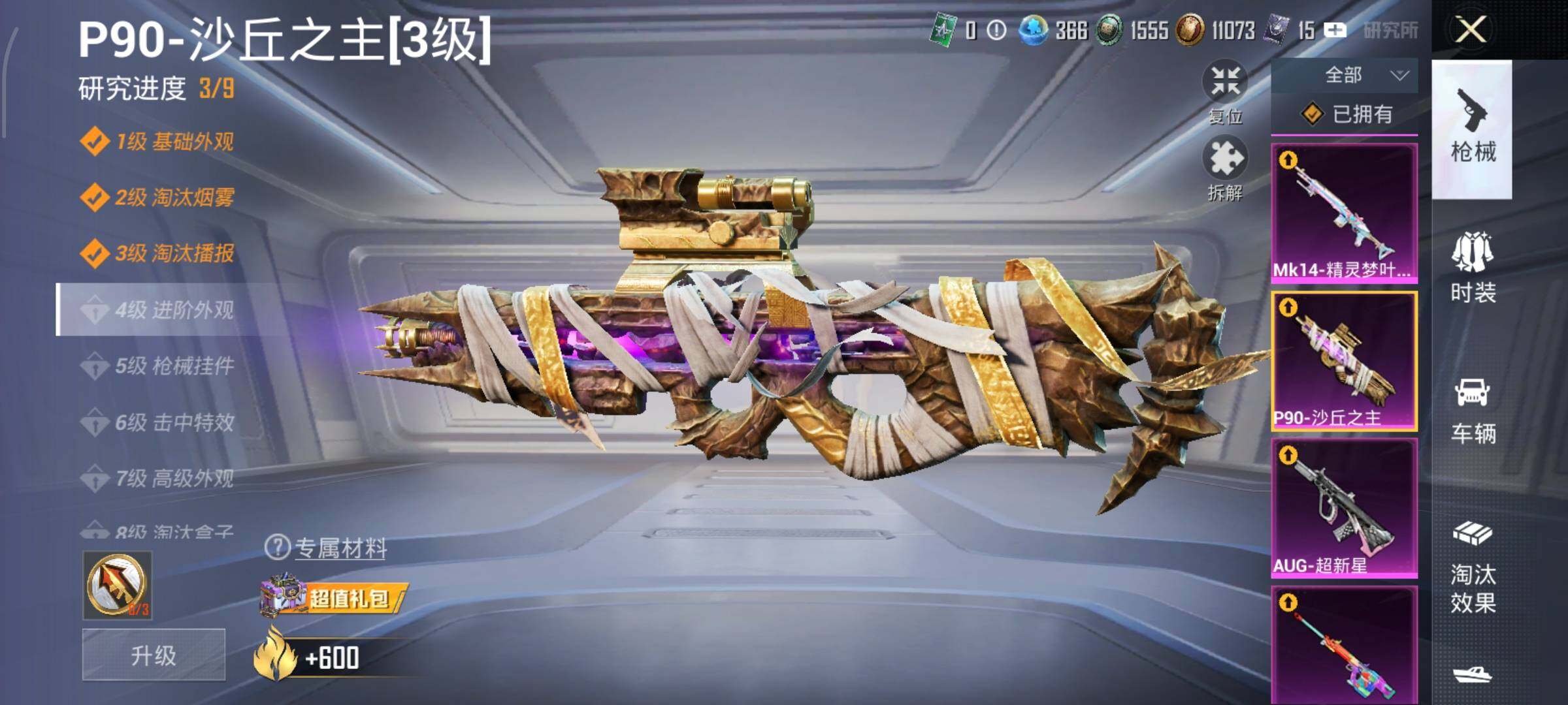 【粉色枪皮等级】:AKM-梦之光华(四级),AKM-幽焰骑士(三级),M16A4-垂柳戏鸭(四级),SCAR-L-机甲封神(三级),SCAR-L-金蛇镇世(三级),M416-五爪金龙(三级),M416-至情至圣(八级),M416-墨龙九天(三级),GROZA-焦糖拿铁(四级),AUG-超新星(六级),Famas-初号机 觉醒Ver.(三级),UMP45-量子极限(五级),UMP45-宇宙意志(三级),Vector-红伞翩翩(一级),Vector-环太平洋(四级),Vector-最终圣卫者(三级),汤姆逊-星