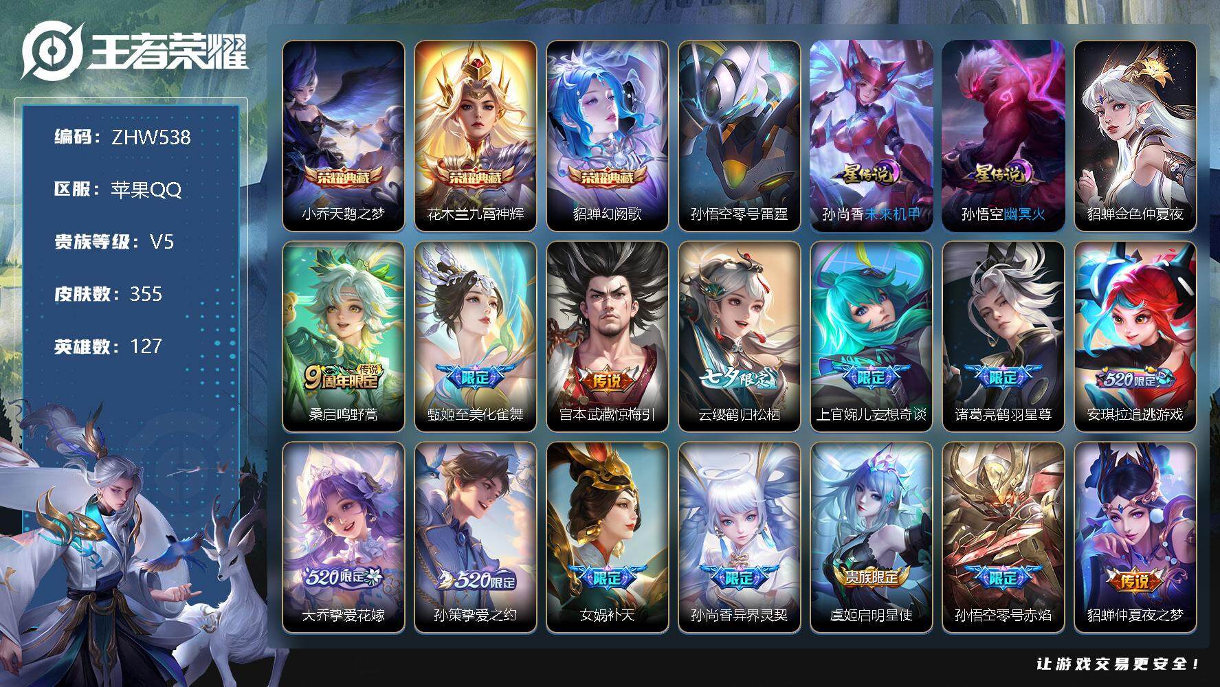 [12559325]【商品标题】:苹果Q-V5-尊贵铂金I段位-127英雄-355皮肤-3典藏-4星元-16传说-115史诗