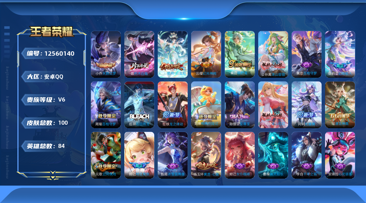 [12560140]【特价急出/详情看图】:安卓Q-V6-最强王者段位-85英雄-100皮肤-1典藏-1珍品传说-3传说-35史诗