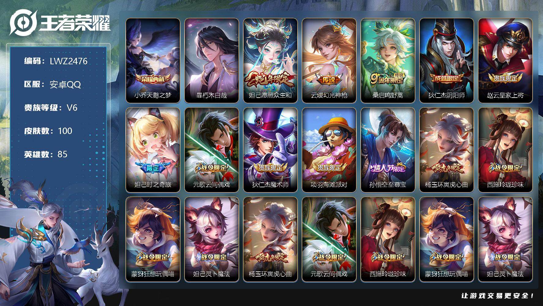 [12560140]【特价急出/详情看图】:安卓Q-V6-最强王者段位-85英雄-100皮肤-1典藏-1珍品传说-3传说-35史诗 【英雄全皮】:孙权全皮,空空儿全皮,少司缘全皮 【荣耀典藏】:小乔天鹅之梦 【珍品传说】:暃朽木白哉 【传说皮肤】:妲己愿照众生和,云缨幻光神枪,桑启鸣野蒿 【限定皮肤】:狄仁杰阴阳师,赵云皇家上将,妲己时之奇旅,元歌云间偶戏,狄仁杰魔术师,项羽海滩派对,孙悟空至尊宝,杨玉环寅虎心曲,西施玲珑珍味,蒙犽狂想玩偶喵,妲己灵卜魔法 【年限皮肤】:杨玉环寅虎心曲 【战令限定】:元歌云间偶戏,西施玲珑珍味,蒙犽狂想玩偶喵,妲己灵卜魔法 【史诗皮肤】:赵云皇家上将,甄姬冰雪圆舞曲,王昭君偶像歌手,狄仁杰魔术师,宫本武藏鬼剑武藏,孙尚香水果甜心,嬴政暗夜贵公子,嬴政摇滚巨星,妲己魅力维加斯,妲己女仆咖啡,曹操幽灵船长,李白千年之狐,张飞乱世虎臣,孙悟空至尊宝,诸葛亮黄金分割率,雅典娜冰冠公主,安琪拉心灵骇客,程咬金功夫厨神,狄仁杰鹰眼统帅,瑶遇见神鹿,蒙犽狂想玩偶喵,元歌云间偶戏,钟馗乐园奇幻夜,杨玉环寅虎心曲,妲己时之奇旅,妲己灵卜魔法,少司缘涂山红红,孙膑茶境仙,阿轲化蝶舞,刘禅鸭鸭历险记,狂铁龙之律动,后羿石田雨龙,周瑜百相守梦,黄忠百相守梦,朵莉亚幻珠鲛人,公孙离涂山容容 【其他皮肤】:项羽海滩派对,安琪拉玩偶对对碰,孙膑天使之翼,姜子牙时尚教父,妲己少女阿狸,亚瑟死亡骑士,达摩拳王,花木兰兔女郎,狄仁杰阴阳师,刘备汉昭烈帝,明世隐虹云星官,小乔丁香结,刘禅秘密基地,盘古重装意志,典韦铁甲之心,妲己紫罗兰之誓,马可波罗潮玩牛仔,蒙恬蔚蓝守将,海月幻泉雾影,太乙真人劲辣红锅,西施玲珑珍味,妲己灵卜魔法,朵莉亚金色潮汐,廉颇功夫炙烤,东皇太一噬灭天穹,苍苍林狼骑,太乙真人谧流熔炉,典韦铁骨偃魂,马超访茗客,西施雪境奇遇,姜子牙星梦巡礼,少司缘灵卦秘语,明世隐景韶洛都,戈娅玫蓝誓约,刘备浪漫序章,钟馗虚灵犬护,沈梦溪鸭鸭历险记,露娜命运加冕,雅典娜潮玩士官长,姬小满小满鸭,白起死霸装,甄姬逆浪荇歌,孙策百相守梦,庄周锦麟游梦,空空儿戏梦巡演,高渐离落日弦歌,莱西奥踏浪烽翎,鬼谷子克喵,桑启青衿临川,哪吒罗小黑战记,张良罗小黑战记,蔡文姬蔷薇王座,大乔伊势巫女,铠龙域领主,女娲尼罗河女神,杨玉环霓裳曲,瑶森,金蝉前尘,桑启画中游 【营地ID】:1600242673