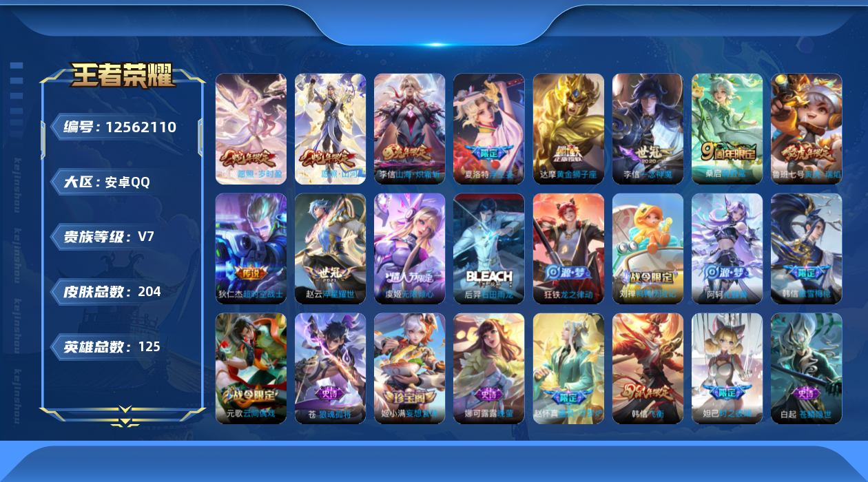[12562110]【商品标题】:安卓Q-V5-尊贵铂金III段位-125英雄-204皮肤-0典藏-0珍品无双-0无双-0珍品传说-11传说-50史诗