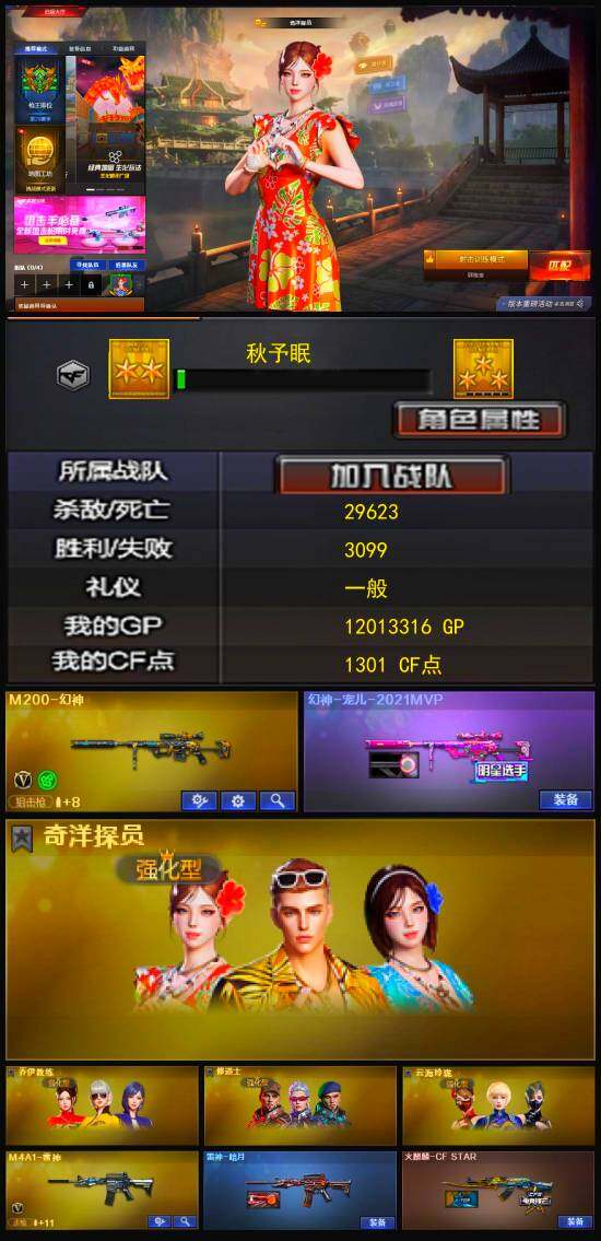 - [6260450]实名: 不可修改 时装数: 301 载具数: 2 枪械数: 102 战备数: 71 热门装扮: 深海小丑鱼,宝贝奶油派,迅捷狂鲨,沙场疾风,碧影闪光,恐龙拽拽,神秘黑猫,兔兔白日梦,音爆索尼克,女娲灵识 载具: 迈凯伦570S(天际蓝),宝马M4(圣保罗黄) 稀有枪皮: AKM炫紫旋律,SCAR-L青春物语,UMP45恐龙拽拽,Kar98K-巳巳如意,M200-伏羲圣卦